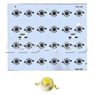 Алюминиевая плата. Размеры 112х135мм. Цвет белый. Для 24-ти (подключение 12+12S, последовательно) мощных светодиодов Emitter. Под блок линз 24B60.
