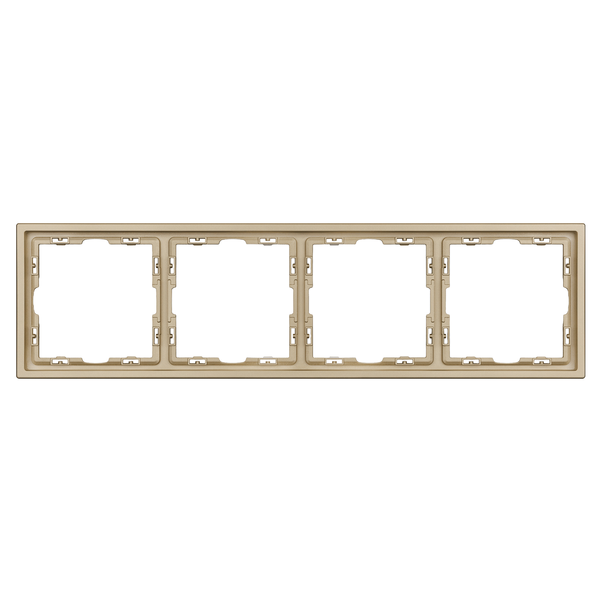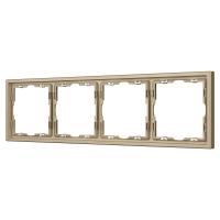 Рамка пластиковая на 4 поста, под встраиваемый механизм. Цвет - золотой, с Soft-Touch покрытием. Среднего уровня герметичности IP20. Ориентация монтажа горизонтальная.