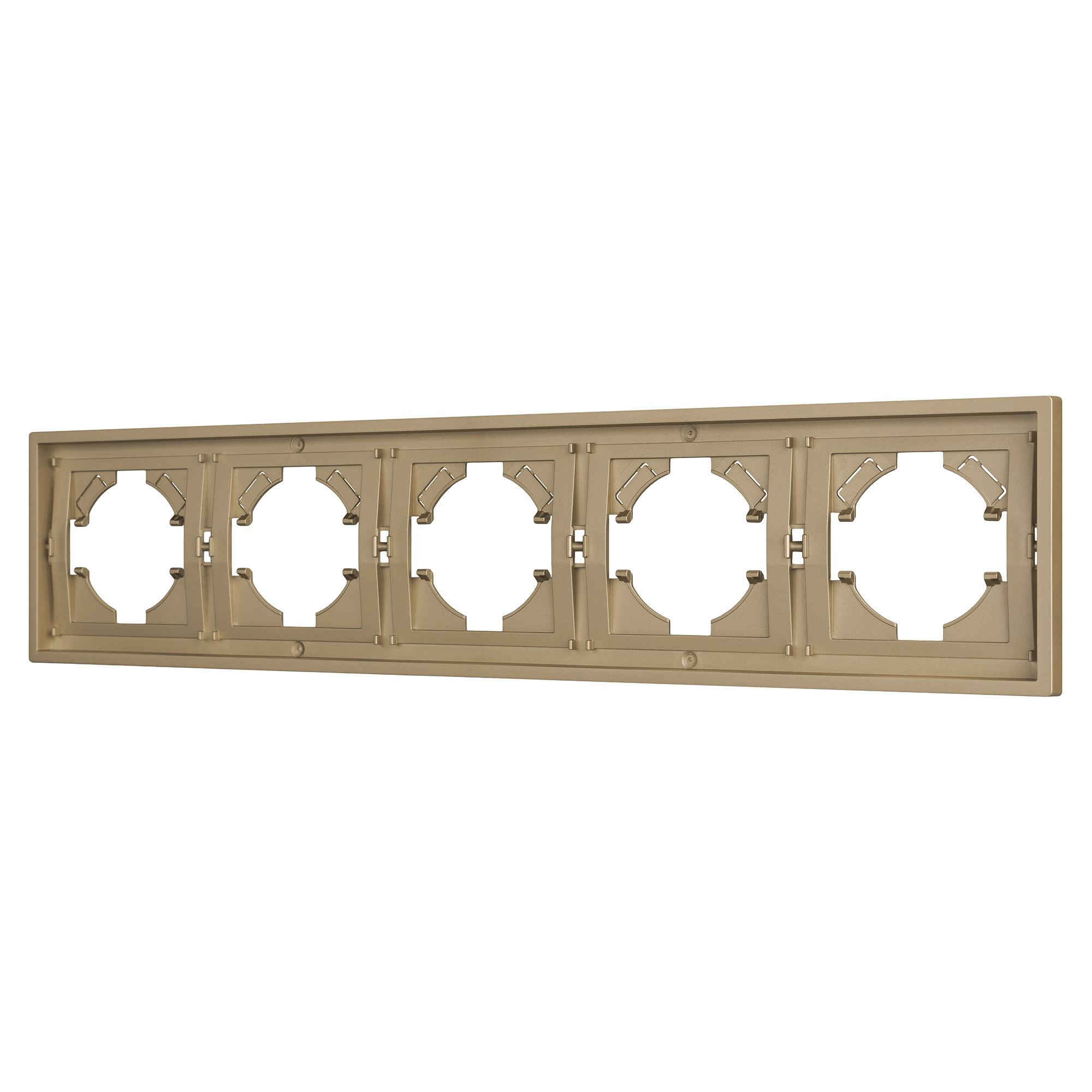 Рамка пластиковая на 5 постов, под встраиваемый механизм. Цвет - золотой, с Soft-Touch покрытием. Среднего уровня герметичности IP20. Ориентация монтажа горизонтальная.
