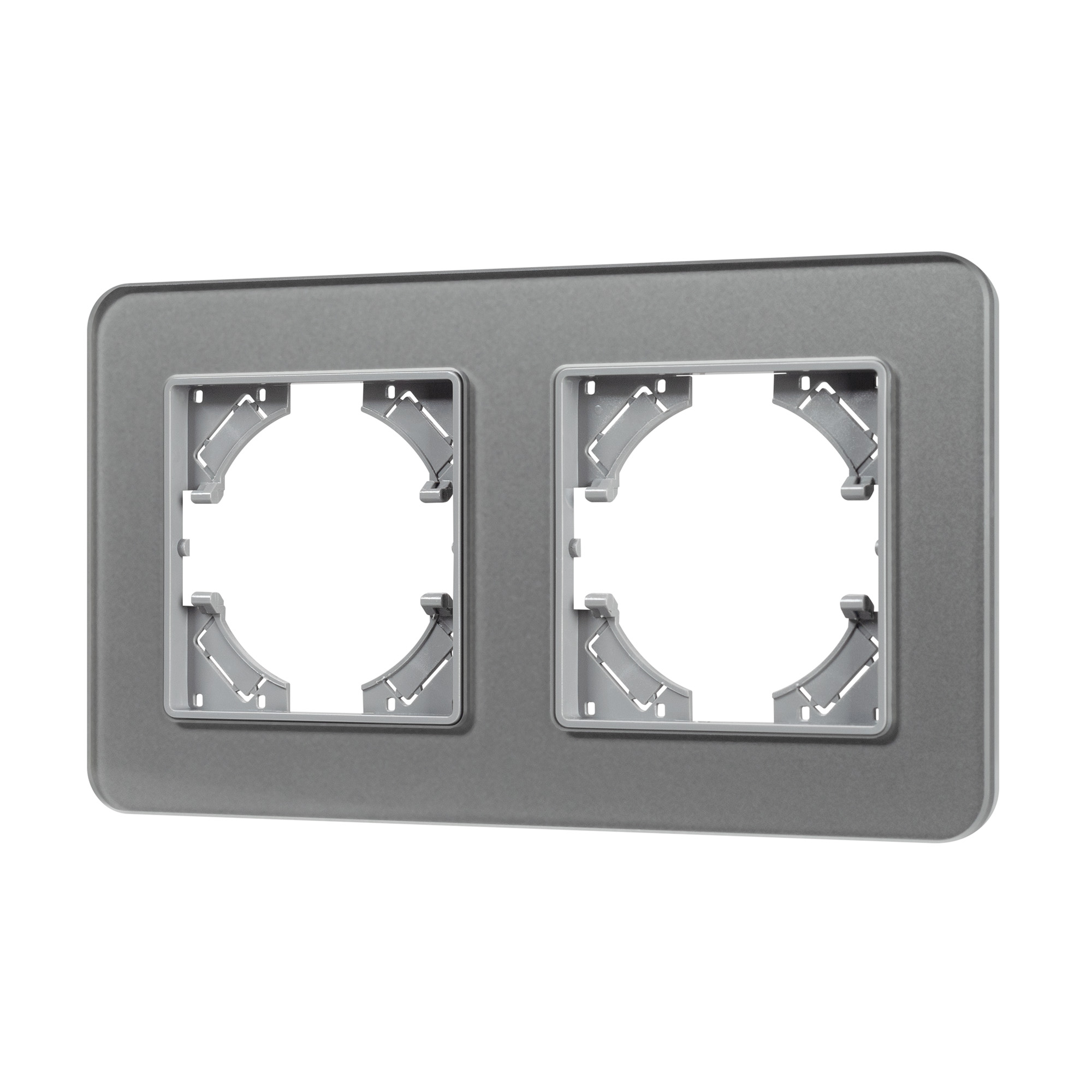 Рамка стеклянная на 2 поста, под встраиваемый механизм. Цвет - серый с Soft-Touch покрытием. Среднего уровня герметичности IP20. Ориентация монтажа - горизонтальная (основным ориентиром служат посадочные выступы для накладки механизма).