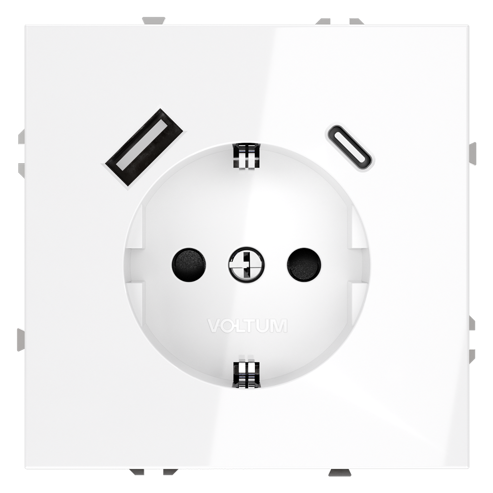 —Розетка встраиваемая VOLTUM S70 с заземлением и защитными шторками 16А с USB A+С (белый глянцевы