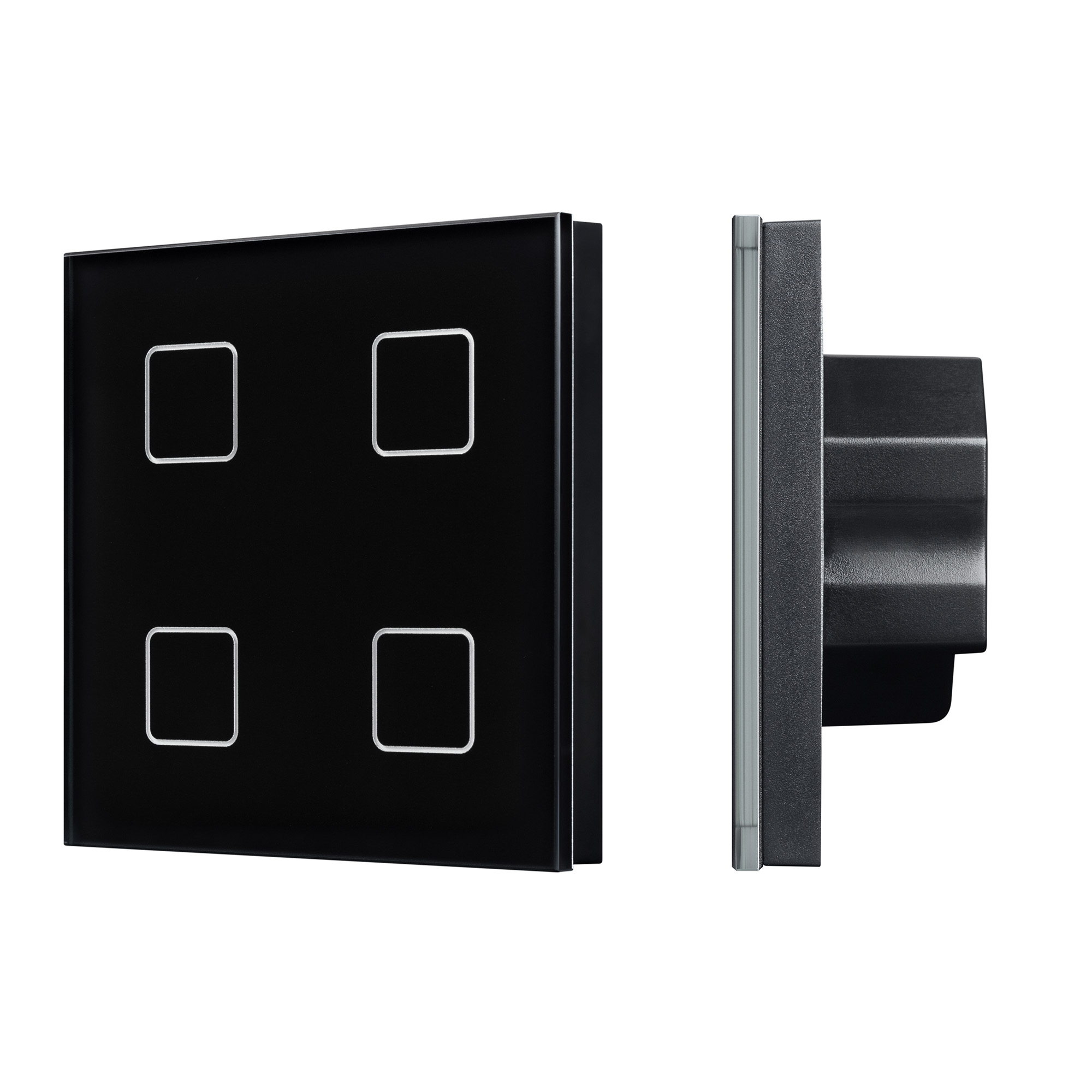Встраиваемая стеклянная сенсорная панель DALI. Цвет - чёрный. 4 кнопки, управление 4 адресами DALI. Каждой кнопкой выполняется включение, выключение и диммирование по соответствующему ей адресу. Установка стартового адреса управления выполняется переключателями на корпусе. Питание 24VDC, либо по шине DALI. Подсветка кнопок, датчик приближения, звуковой сигнал срабатывания. led-ted.ru Габариты 86x86x34.5 мм