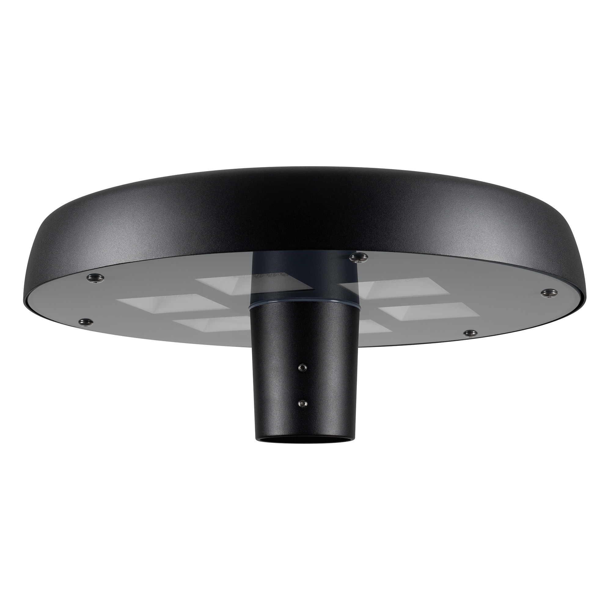 Венчающий светодиодный светильник. Мощность 50 Вт, св. поток 5680 лм, 112 лм/Вт, тёплый 2700 K, CRI>80, угол 140°, напряжение питания 230 В. Черный корпус из алюминия, экран стекло, степень защиты IP65. led-ted.ru Размер: диаметр 510 мм, высота 200 мм. Монтаж на вертикальную опору диаметром 76 мм.