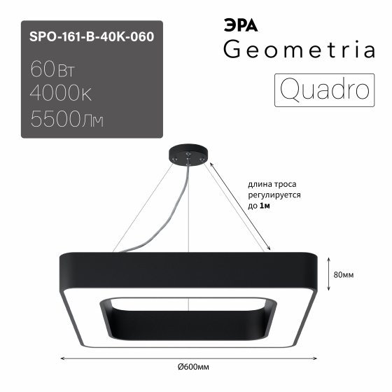 Светильник LED Geometria SPO-161-B-40K-060 Quadro 60Вт 4000К 5500Лм IP40 600*80 черный подвесной драйвер внутри Подвесные светильники Geometria различных форм и размеров позволят реализовать дизайнерские идеи освещения пространства. Для каждой модели доступно 2 варианта цвета: белый и черный. Предусмотрена возможность регулировки высоты установки до 1м при помощи троса. В комплект поставки входит круглое крепление к потолку. Подвесная система максимально эстетична, питание идет по тросу. Корпус изготовлен из стали, покрытой порошковой окраской. Изолированный блок питания внутри коруса, входит в комплект.