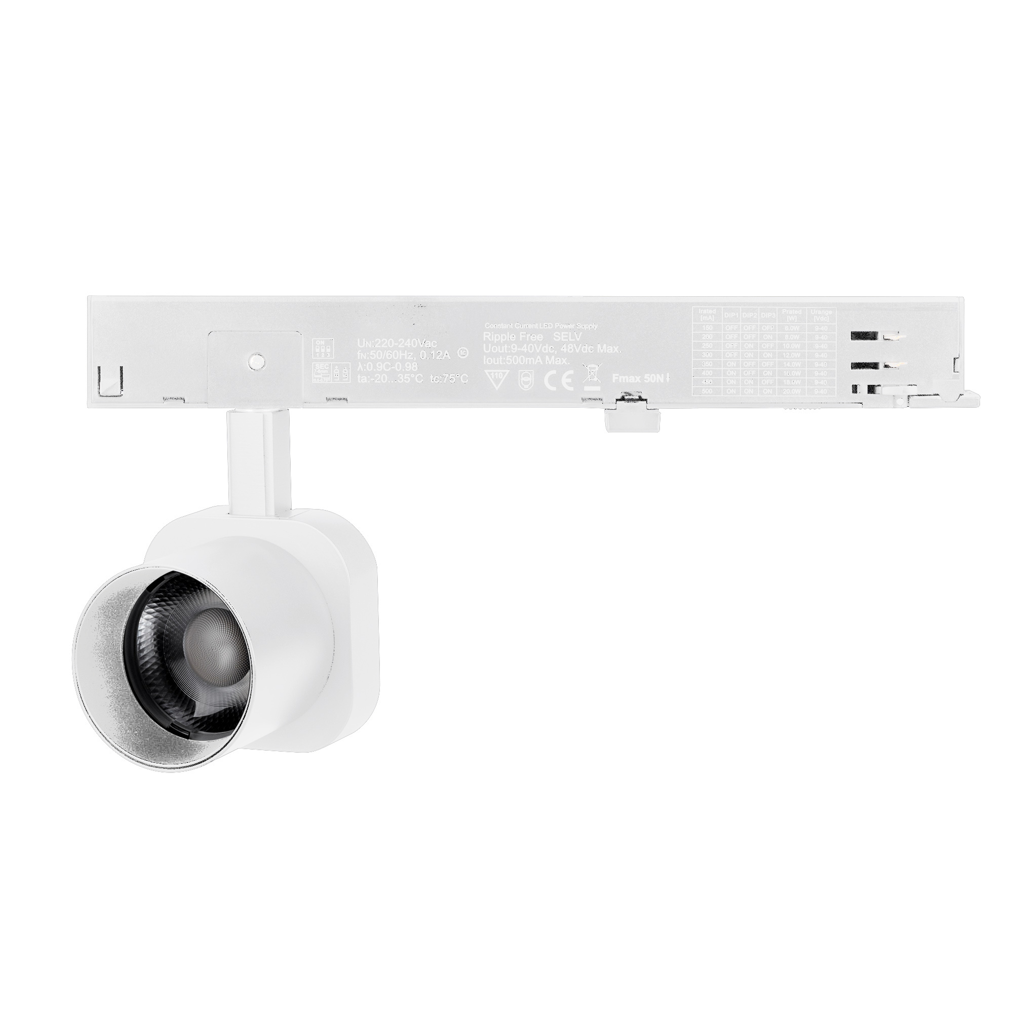 Светильник для треков/шин 4 провода. Мощность 10 Вт, св. поток 740 лм, 74 лм/Вт, теплый 2700 K, CRI>95, угол 60°, напряжение питания 230 В. Решетка HONEYCOMB в комплекте. Белый квадратный корпус из алюминия, материал линзы PC поликарбонат, степень защиты IP20. Размер световой части 60х60х62 мм. Монтаж на трек 3-фазный. Драйвер встроенный 9-40 В, 250мА., пульсация <1%