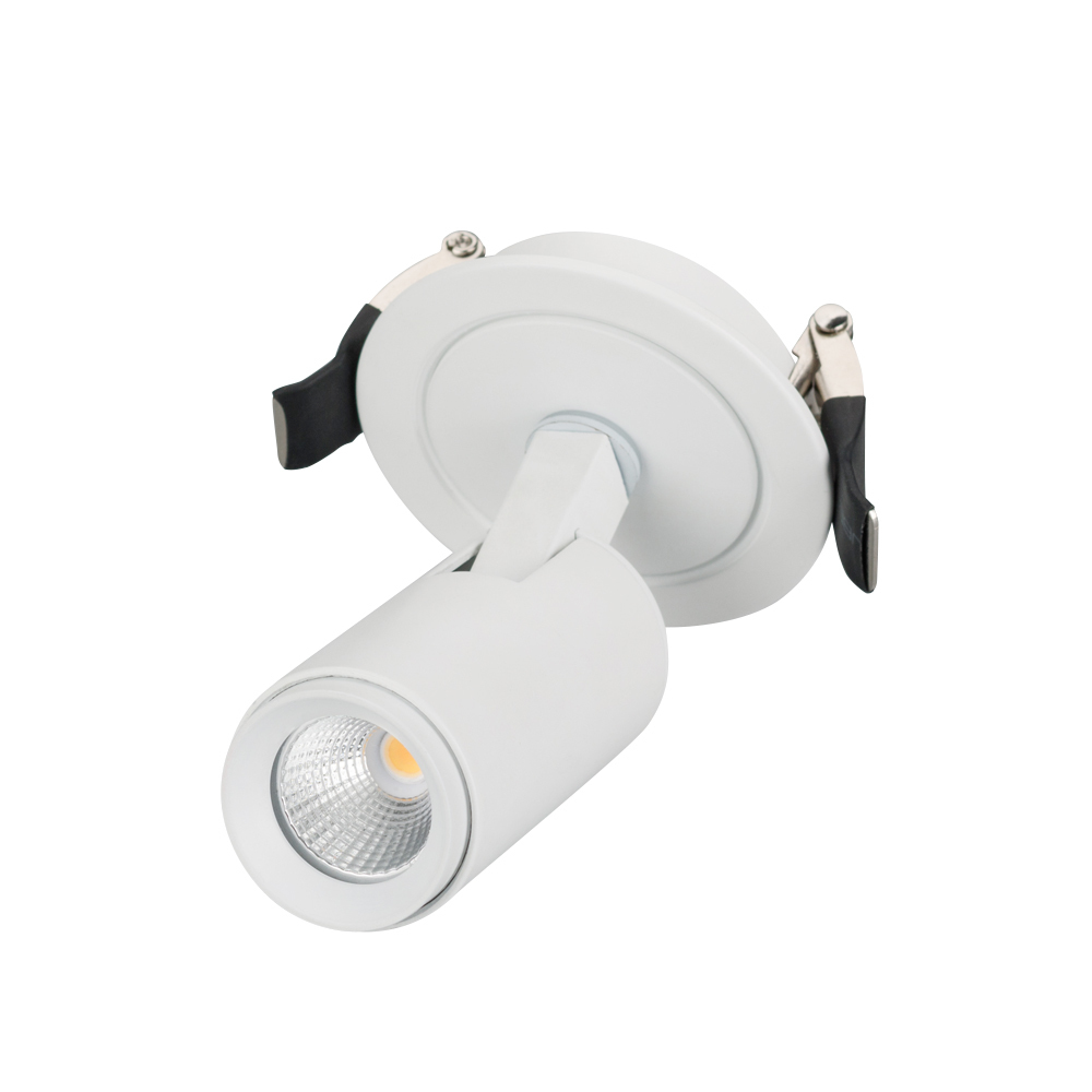 Встраиваемый поворотный светильник для потолка. Светодиод 5W, цвет ТЕПЛЫЙ БЕЛЫЙ 3000K, св.поток 350лм, угол 38°, RA>80. Корпус белый. Мощность 5Вт, питание AC180-240V. Размеры ?DxLxH 35x70x60мм. Установка в отверстие 60мм. Драйвер в комплекте (8-12V 400mA).