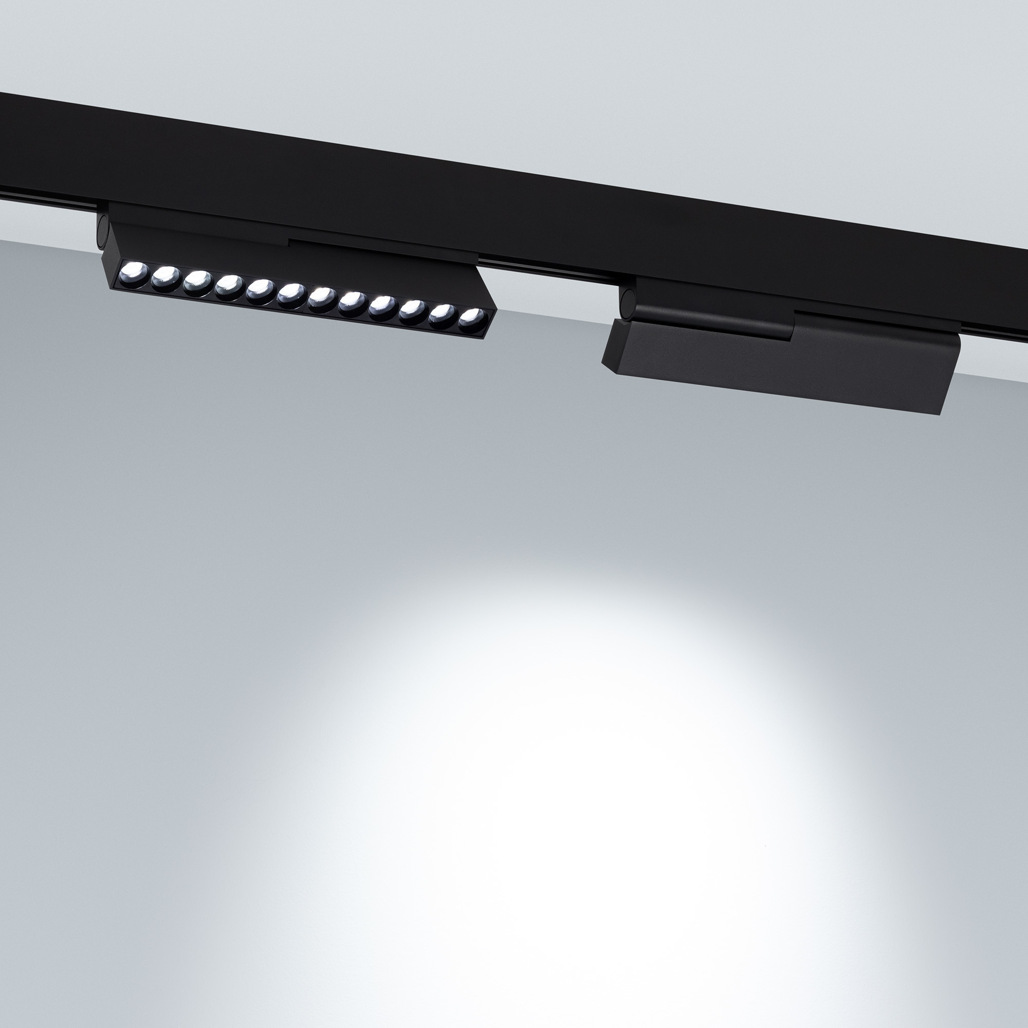 Светильник для магнитных треков MAG-ORIENT шириной 26 мм с управлением DALI и изменяемой цветовой температурой. Мощность 12 Вт, св. поток 770-950 лм, 64-79 лм/Вт, изменяемая цветовая температура 2700-6500 K, CRI>90, угол 30°, напряжение питания 48 В. Черный прямоугольный корпус из металл, экран поликарбонат, степень защиты IP20. Размер: длина 231 мм, ширина 23 мм, высота 99 мм. Монтаж на трек MAG-ORIENT. Пульсация <1%.