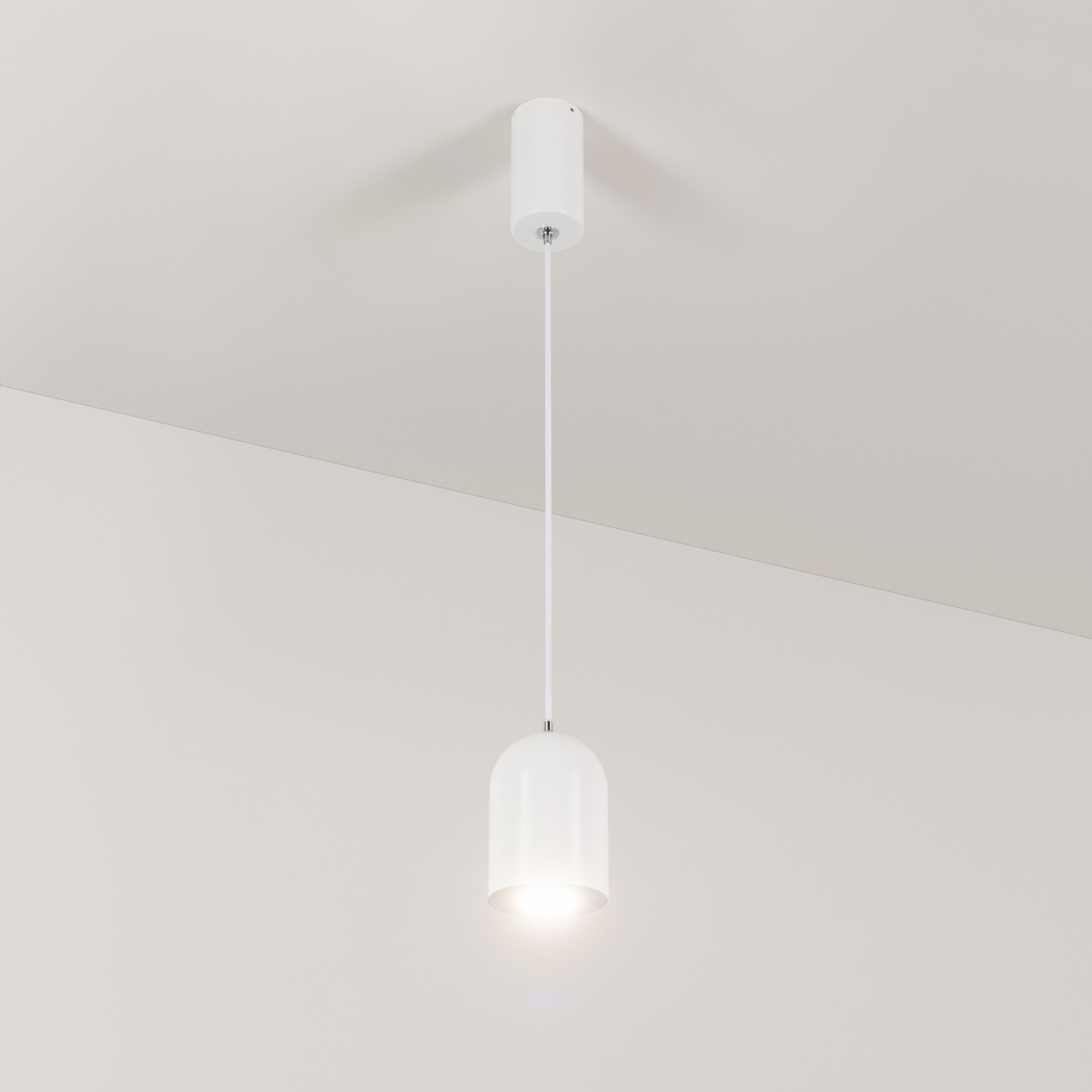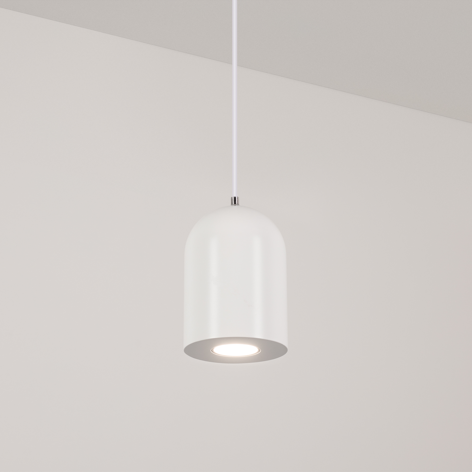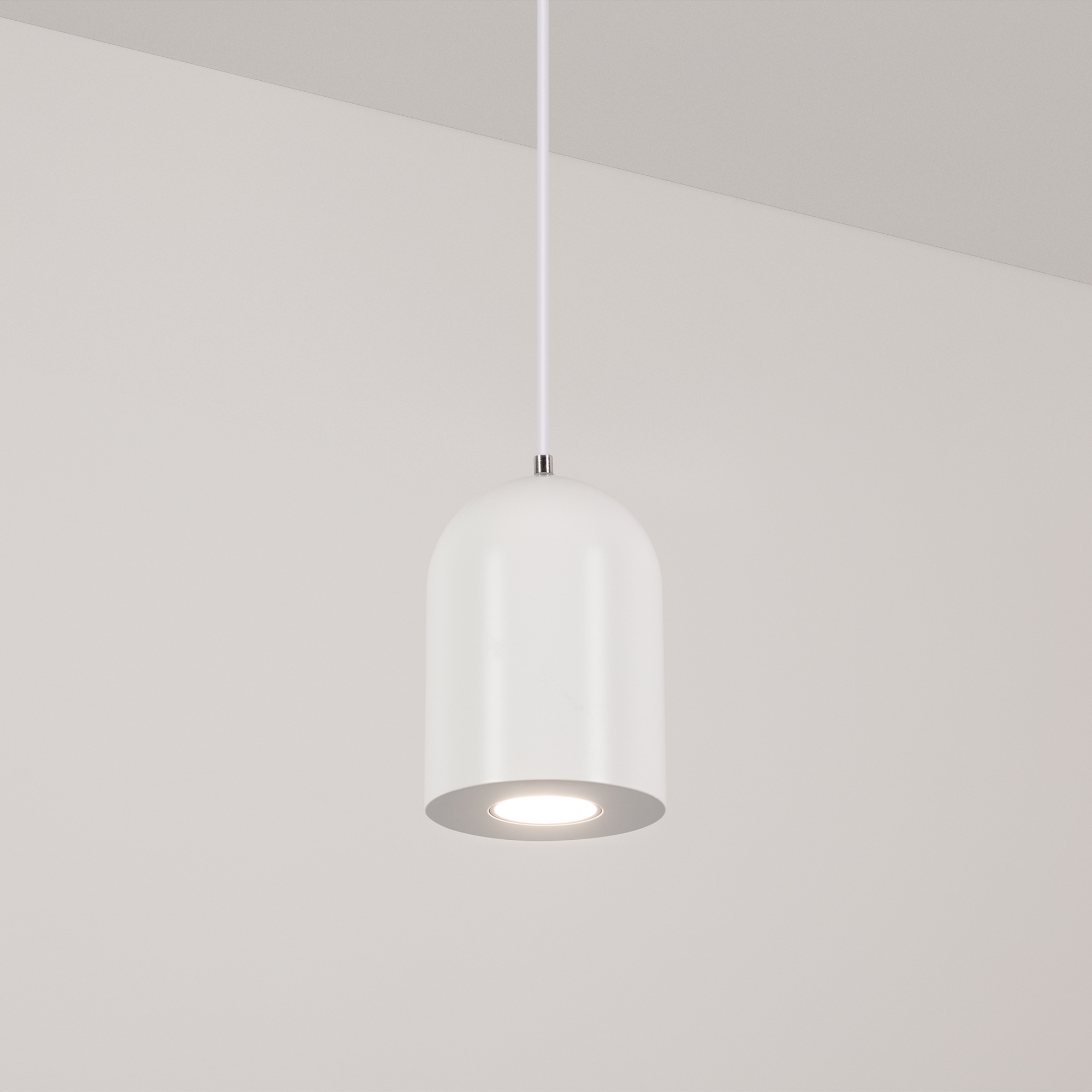 Подвесной светильник. Мощность 9 Вт, св. поток 650 лм, 73 лм/Вт, дневной 4000 K, CRI>80, угол 39°, напряжение питания 230 В. Белый корпус из алюминия, экран , степень защиты IP40. Размер: диаметр 71 мм, высота 100 мм. Монтаж подвесной, длина подвеса 1500мм, регулируемая. Габариты чаши 50x95 мм. Драйвер 28-42 В, 250 мА, пульсация <5%.