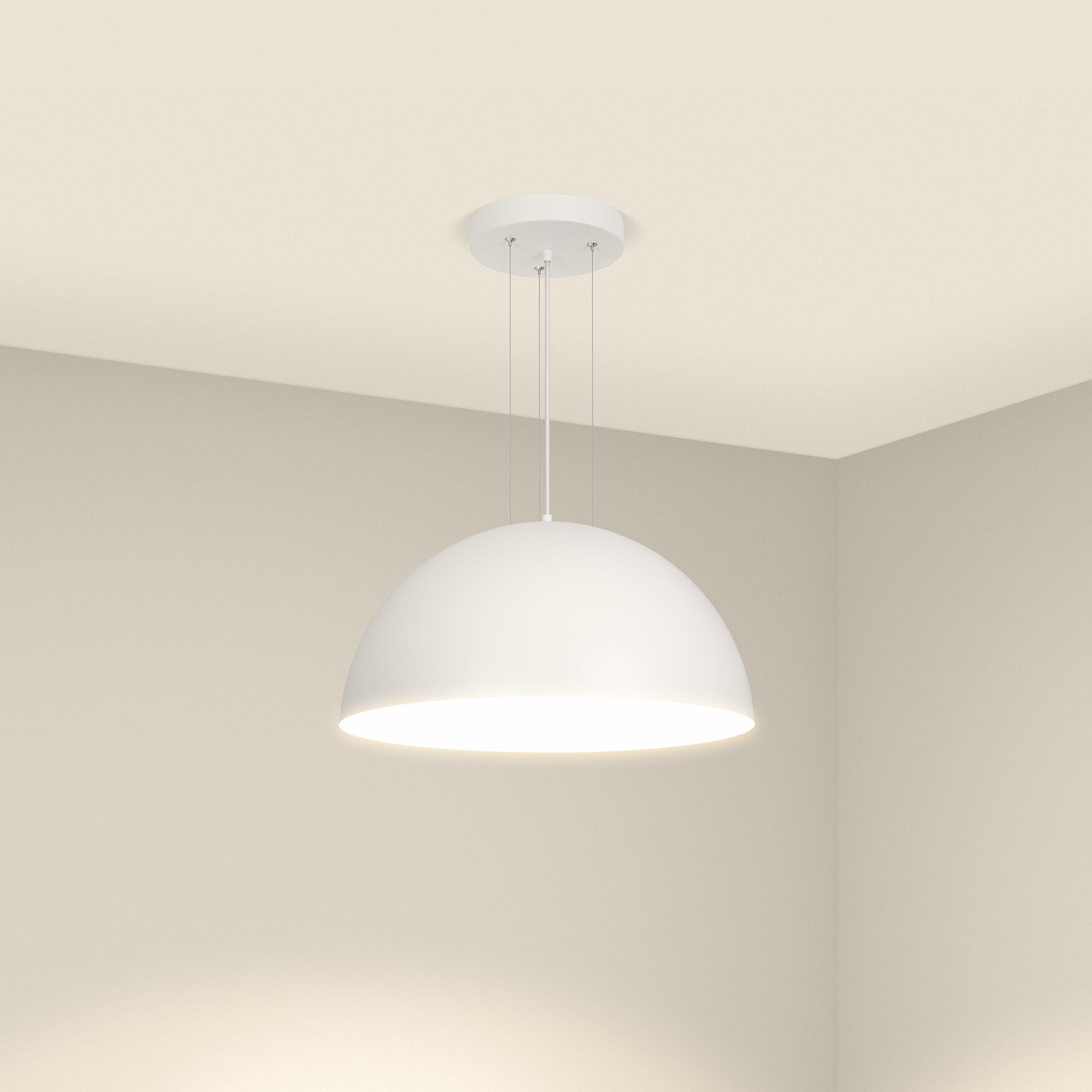 Подвесной светильник. Мощность 30 Вт, св. поток 1900 лм, 55 лм/Вт, дневной 4000 K, CRI>90, угол 100°, напряжение питания 230 В. Белый круглый корпус из алюминия, степень защиты IP20. Размер: диаметр 500 мм, высота 250 мм, размер чаши: диаметр 200 мм, высота 35 мм. Монтаж подвесной, длина подвеса 1500 мм. Драйвер 24-42 В, 900 мА, пульсация <5%. led-ted.ru