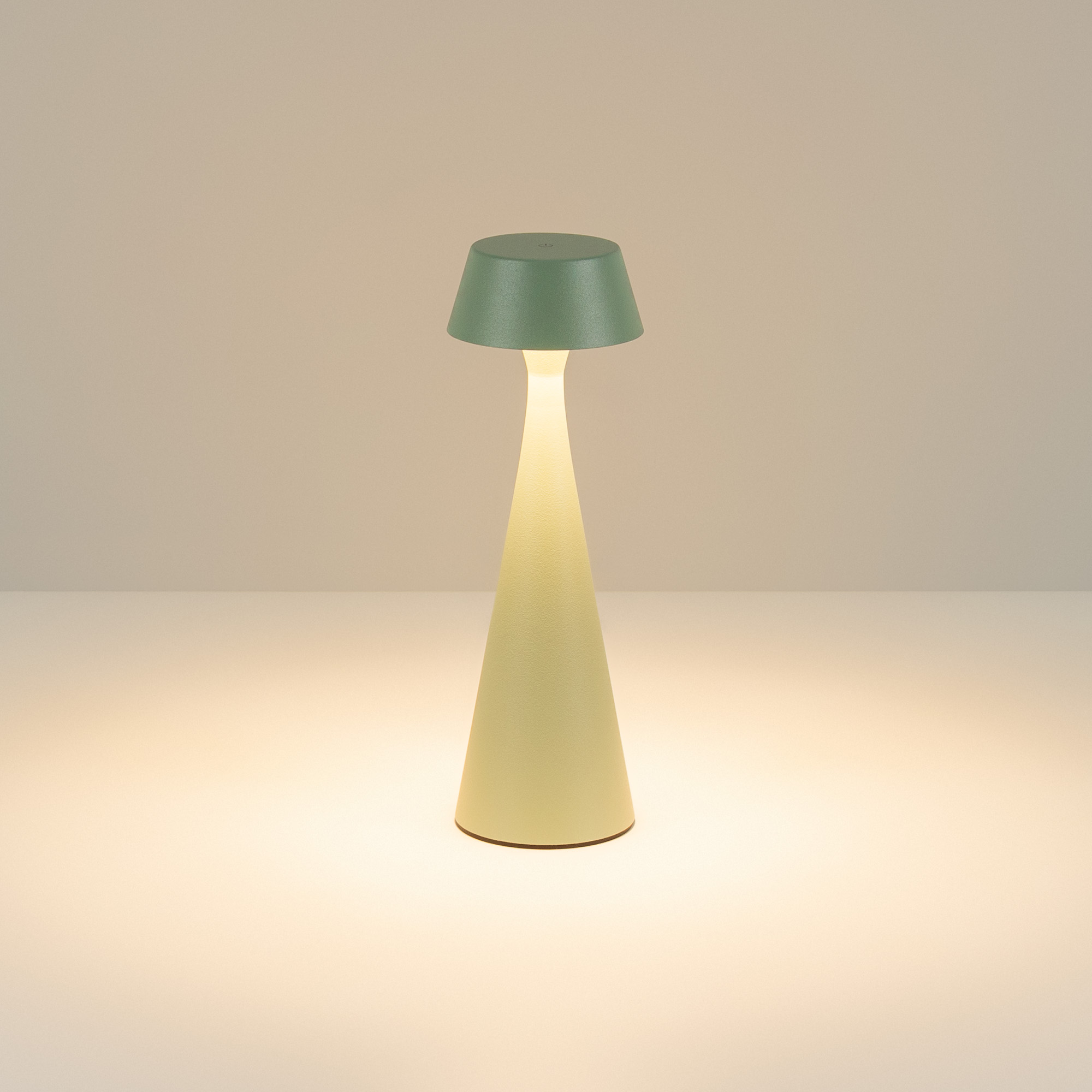 Настольный светильник со встроенным аккумулятором, 2Вт, алюминиевый корпус, цвет зеленый. Цвет ТЕПЛЫЙ БЕЛЫЙ 2200-2700-3000K, св.поток 110-130 лм, CRI(Ra)>80, угол 154°. led-ted.ru Размер Ф80x242мм. IP54. Зарядка от сети переменного тока AC220-240V. Тип встроенного аккумулятора 2x2200мАч Li-ion, напряжение батареи 5V