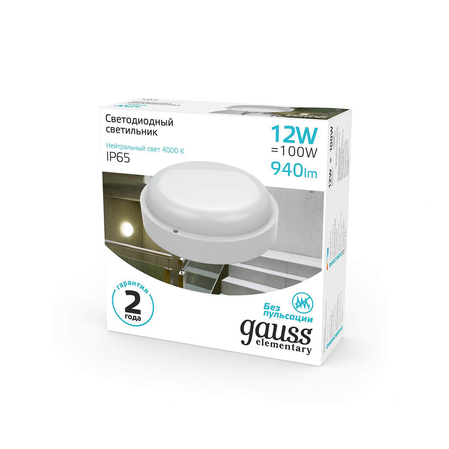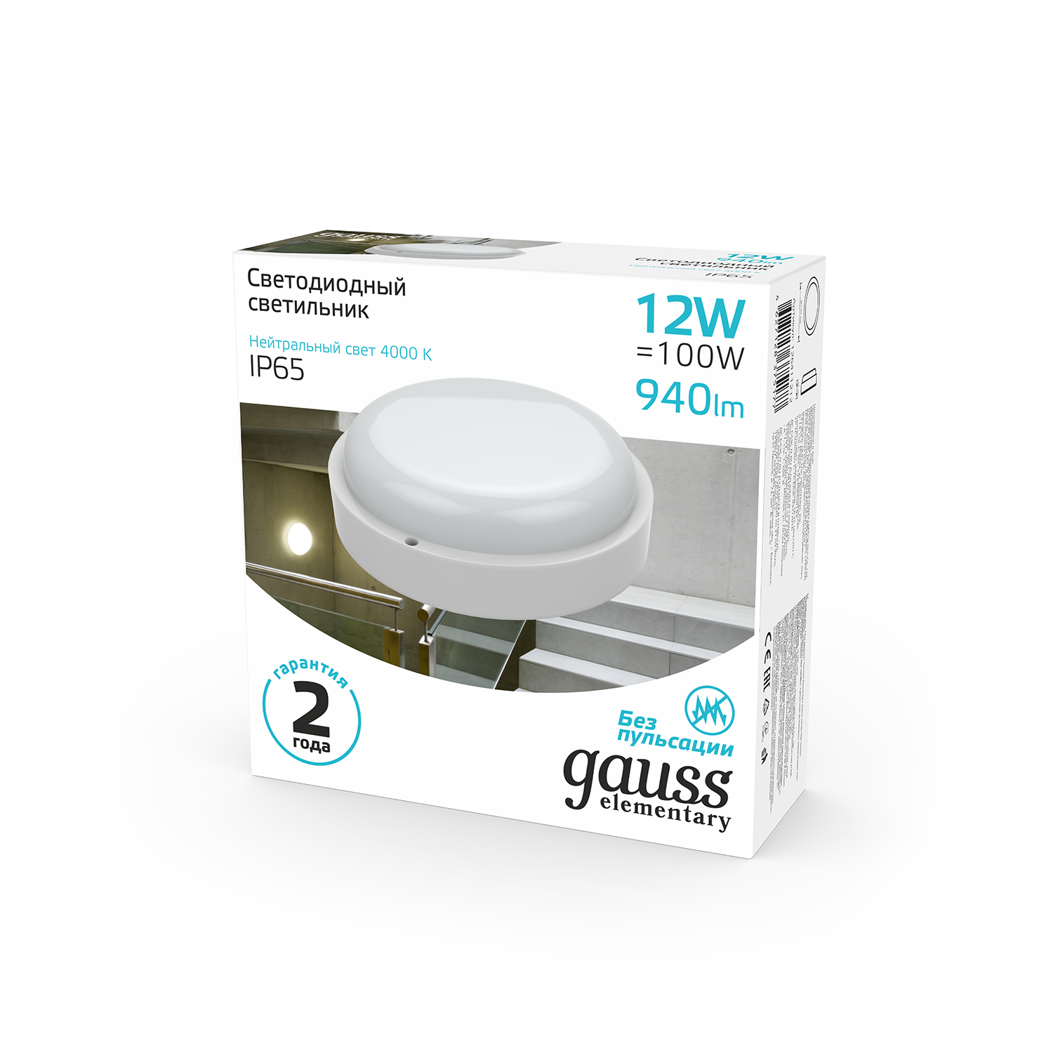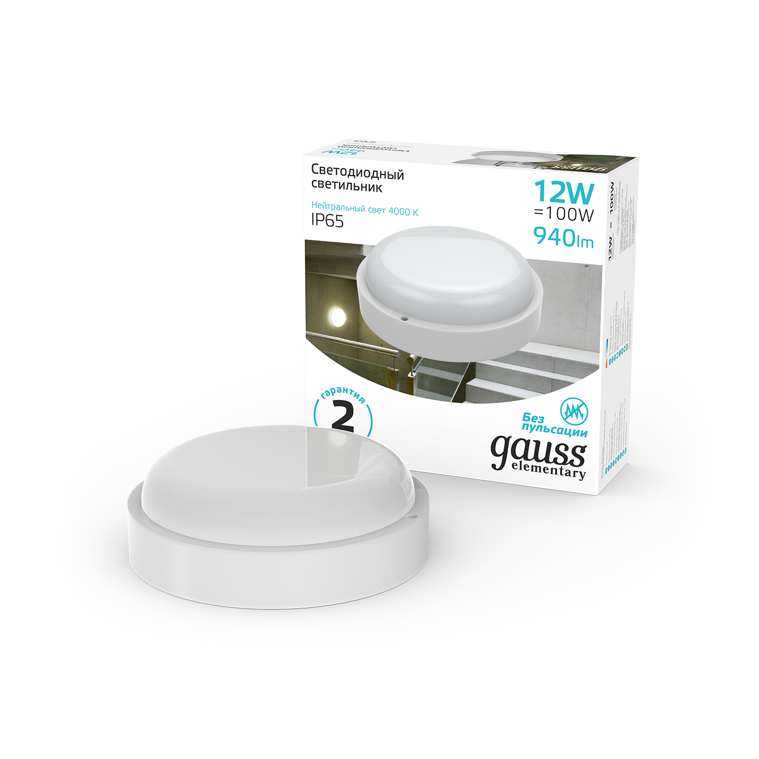 —Светильник светодиодный Gauss IP65 D160*53 12W 940lm 4000K ЖКХ круглый 1/40