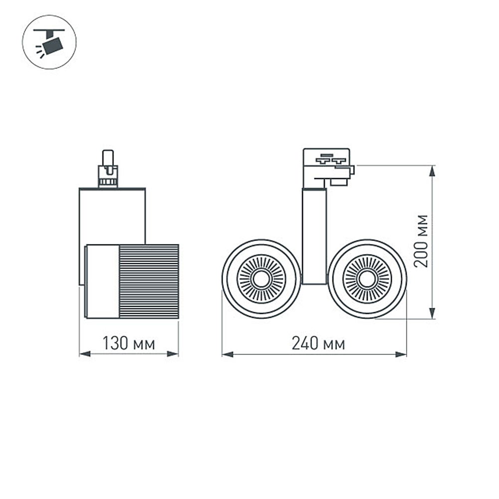 Подвесной светильник двойной для треков/шин 2 провода. Светодиоды 2x15W, цвет БЕЛЫЙ 5000K, св.поток 2200-2400лм, угол 24°, CRI>82. Серебристый с черным корпус. Мощность 30Вт, питание AC220-240V. Максимальные габариты LxWxH: 240x130x200мм.