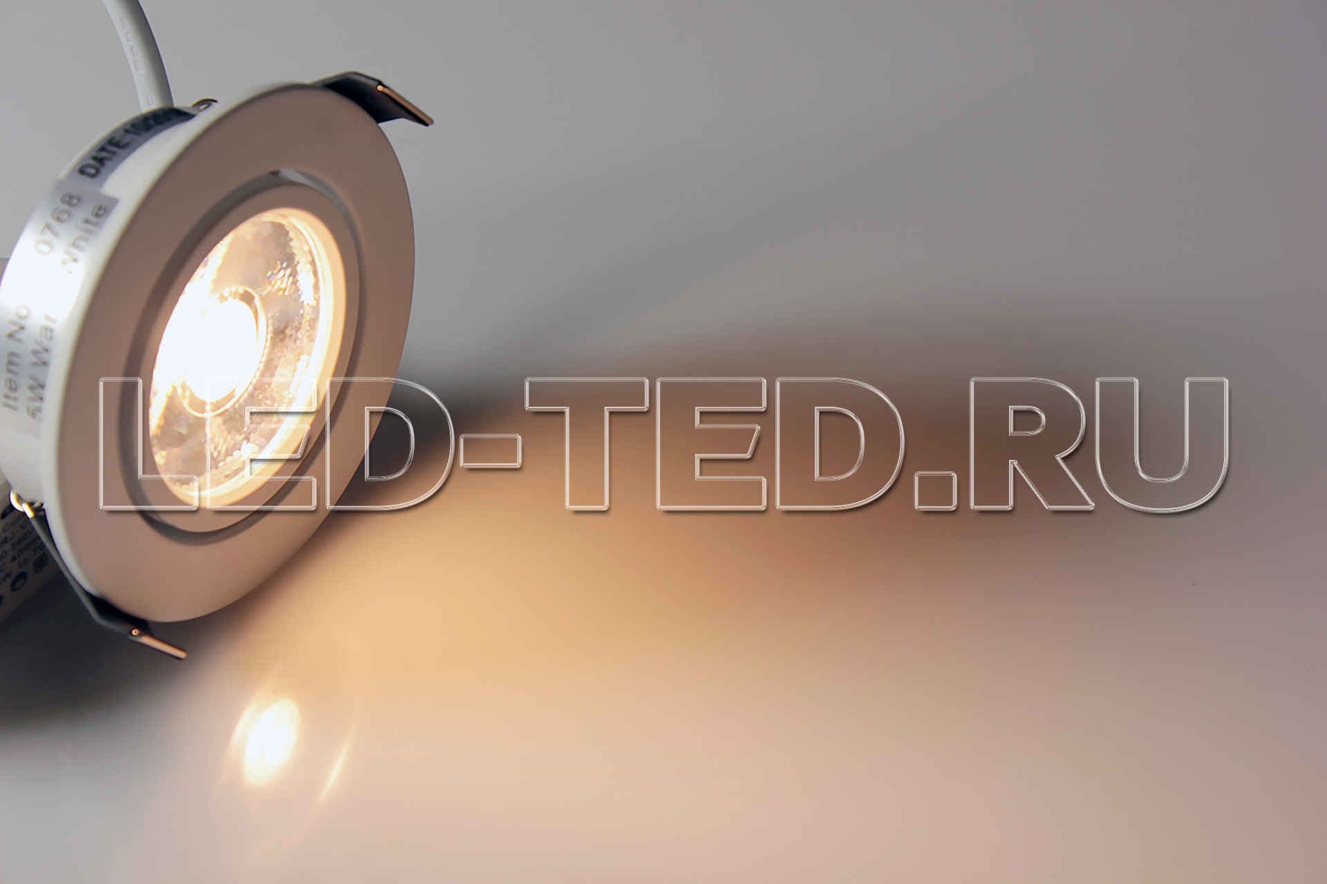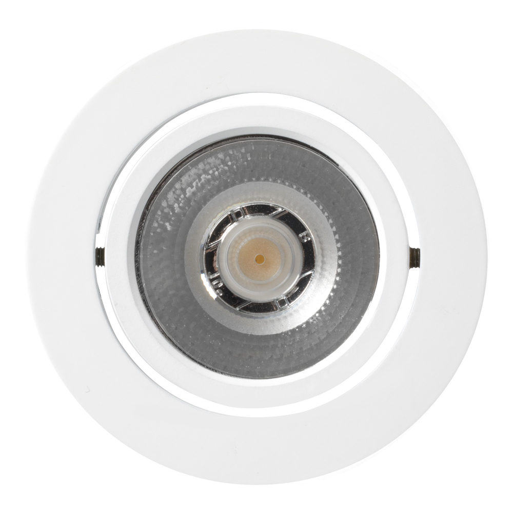 Врезной круглый мебельный светильник 5Вт, корпус белый алюминий. Цвет ТЕПЛЫЙ БЕЛЫЙ 3000K. Светодиод 1х5W Bridgelux. CRI>80, Св.поток 350-400лм, наклоняемая ось, угол 10°. Питание 180-240VAC, 5Вт, 400mA 11-13V, драйвер в комплекте. Размеры d65x20 мм, врезное отверстие d55 мм.