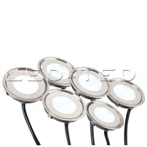 Набор в коробке - 6 шт. герметичных IP67 круглых LED-светильников для установки в пол/стены. Цвет холодный 6000К, мощность 6х0,5 Вт, питание DC12V. Размер Ф58хН9 мм, корпус - нержавеющая сталь+стекло. В комплекте: светильник с 1 м кабелем - 6 шт., драйвер 220В со шнуром 2 м, соединительный провод 6х0,5 м. Цена за комплект.