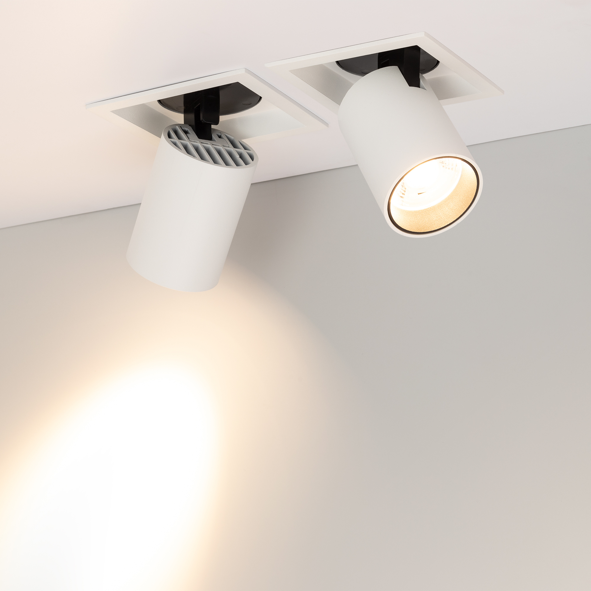 Встраиваемый поворотный выдвигающийся светильник для потолка. Мощность 10 Вт, св. поток 900 лм, 90 лм/Вт, теплый 3000 K, CRI>90, угол 20°, напряжение питания 230 В. Белый квадратный корпус из алюминия, экран PC, степень защиты IP20. Размер (ДШВ) 112112127 мм. Монтаж встраиваемый, установочное отверстие  100 мм. Драйвер 30-48 В, 250 мА, пульсация <1%.