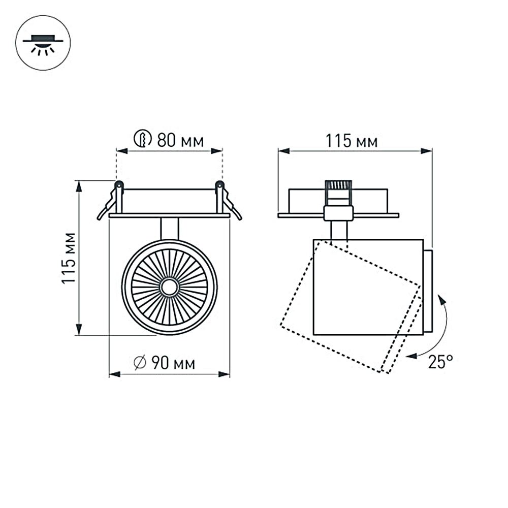 Встраиваемый поворотный светильник для потолка. Светодиод CREE 9W, цвет БЕЛЫЙ 6000K, св.поток 740-813лм, угол 25°, RA>80. Корпус белый. Мощность 9Вт, питание AC110-240V. Максимальные габариты LxWxH 115x90x115мм. Установка в отверстие 80мм. Драйвер в комплекте (20-40V 220mA).