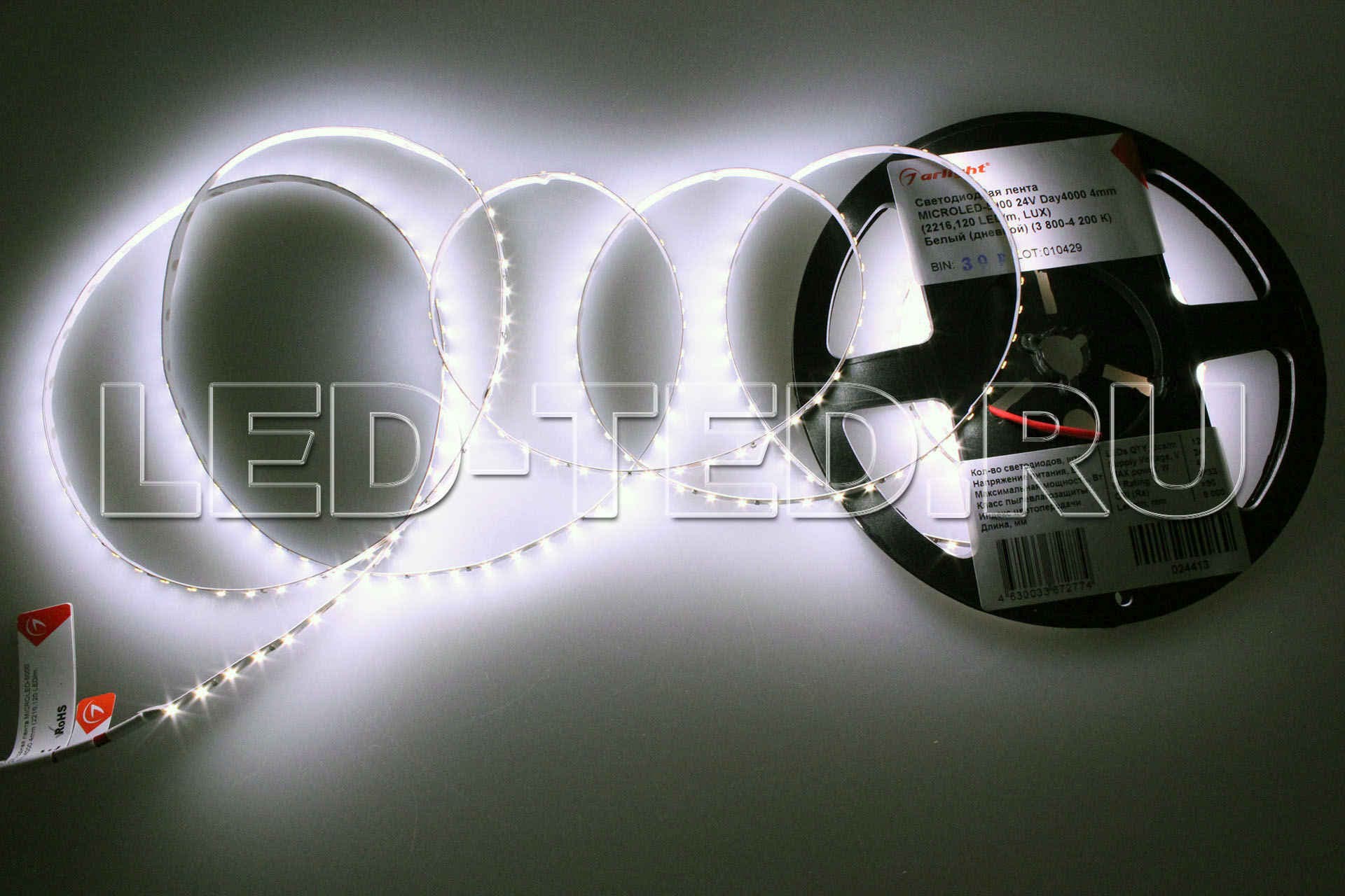 Узкая Лента MICROLED, светодиоды smd 2216, 120шт/м 600шт на 5м, белая плата 4мм, скотч 3М. Цвет ДНЕВНОЙ 3800-4200K. Питание 24V, мощность 9.6 Вт/м 48 Вт на 5м, угол 120°, цветопередача CRI>90. Размеры 5000х4х1.2мм. Мин.отрезок 50мм, 6 светодиодов. Цена за 1м. 024413