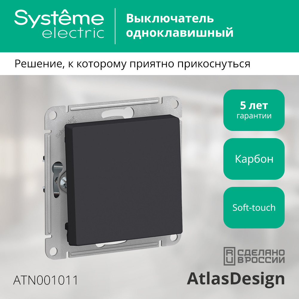 Механизм Systeme Electric (ранее Schneider Electric) серии AtlasDesign в цвете карбон выключателя 1-клавишного подходит для сетей 250 В, на ток 10 А.