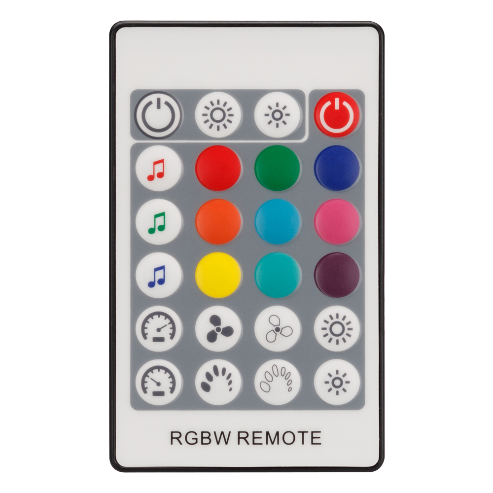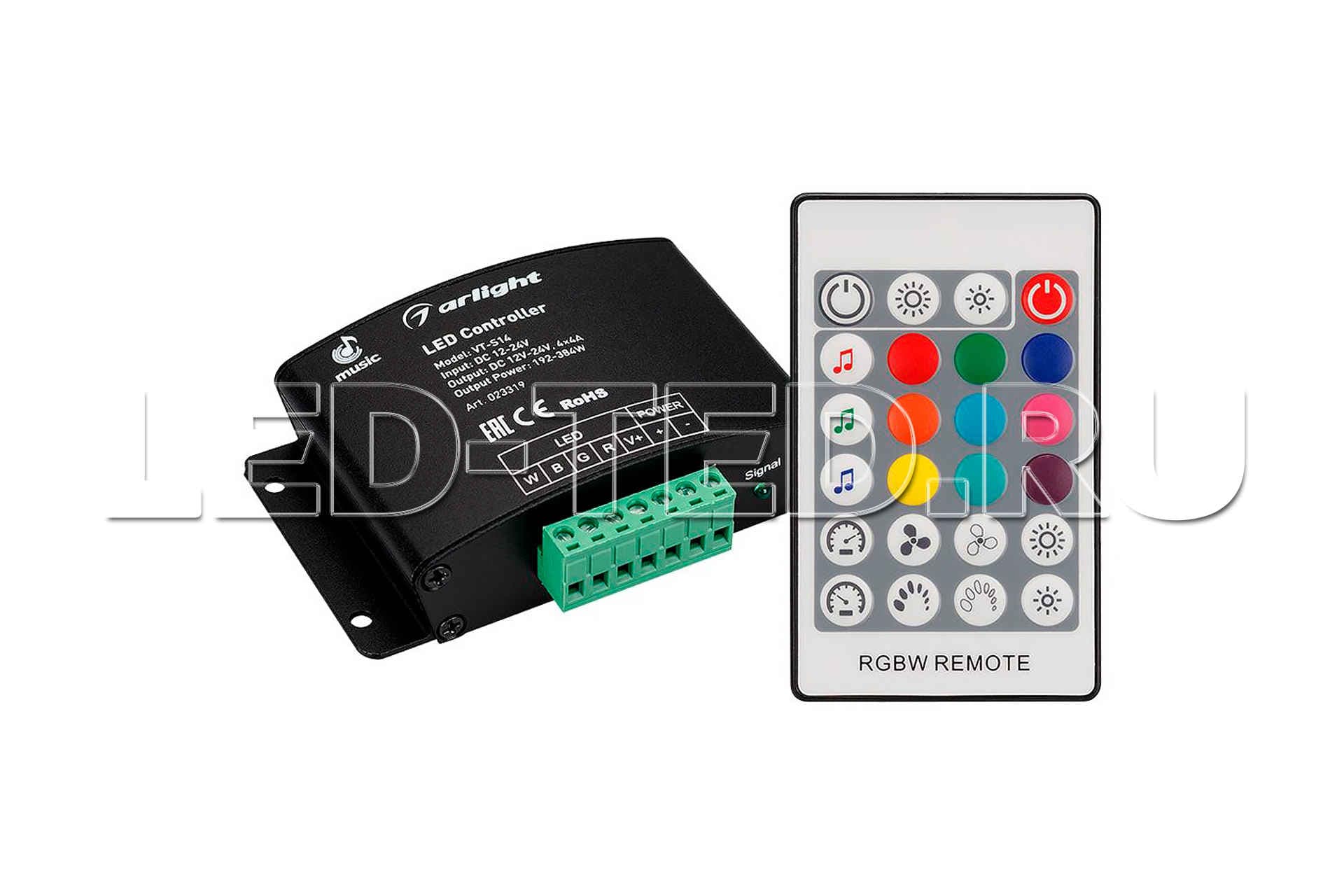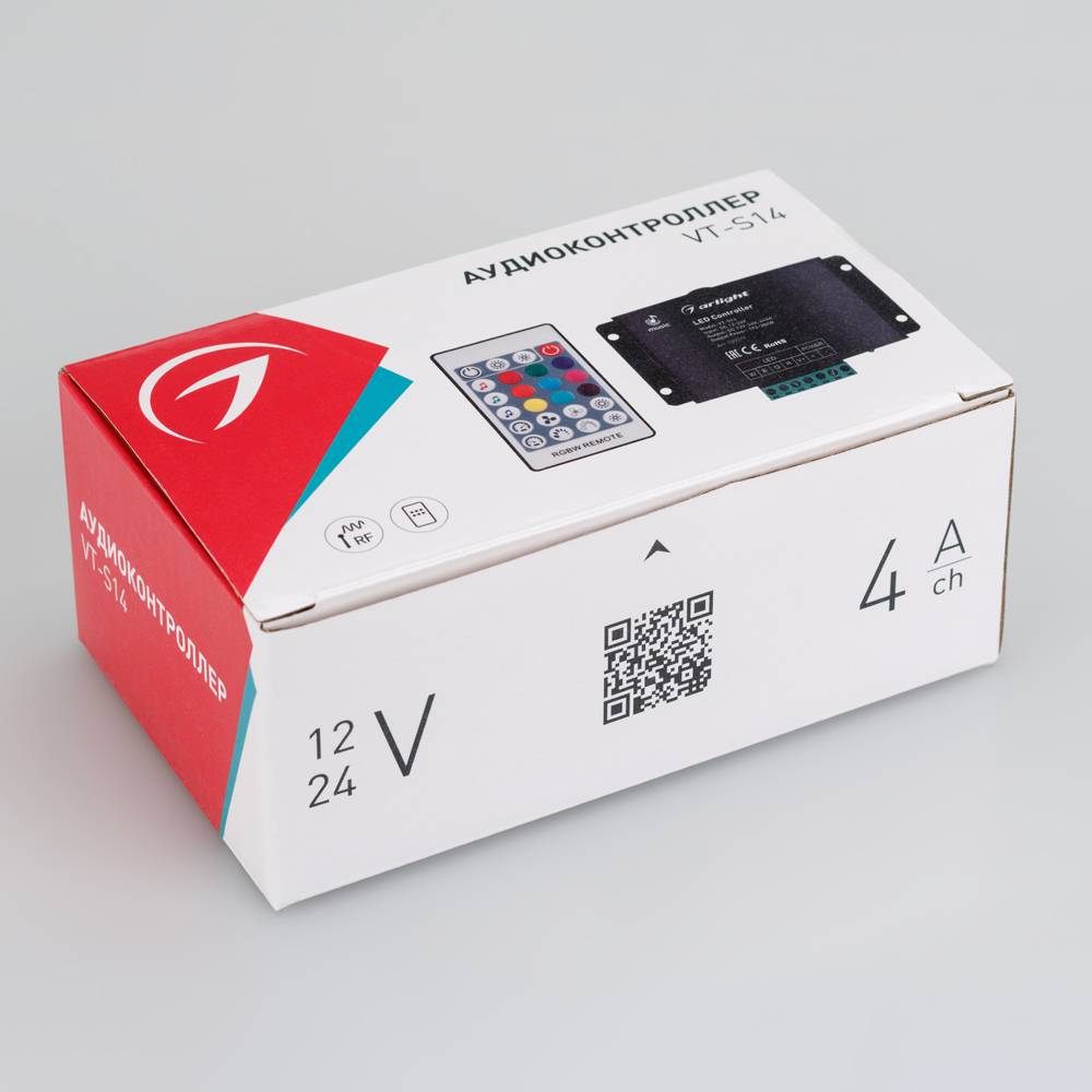 RGBW-АУДИОконтроллер с RF ДУ (24 кнопки), рег-ка яркости, цветности, скорости, 3 аудиорежима. Вход аудио и внешнего микрофона, регулировка усиления. Выход 12-24V 192-384W, 4х4A. Габариты 108х63х28 мм. Вместо 019938.