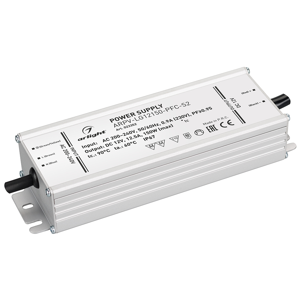 Блок питания 12V с гальванической развязкой, ток 12,5А, 150Вт, герметичный, для светодиодных изделий. Алюминиевый корпус IP67. Совместимость со стандартом EMC. Габариты 190x61x36 mm. Вход. напряж-е 200-240V AC, выход 12V DC +-5%, коэффициент мощности PF>0,95. Диапазон раб. темп. -40..+60 С. Гарантия 5 лет. Замен-ся на 024269. 023352