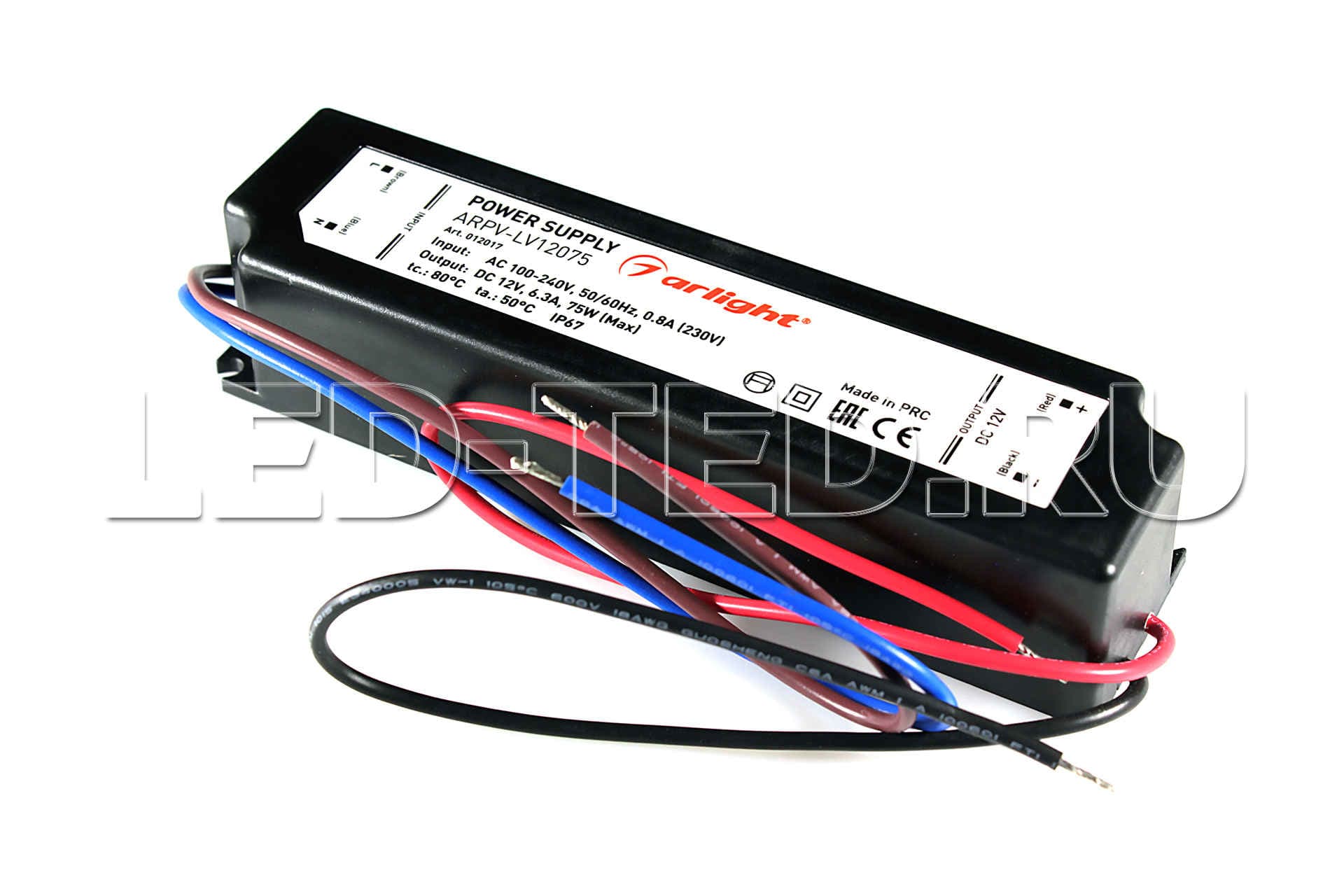 Блок питания 12V с гальванической развязкой, ток 6.3А, 75Вт. Герметичный пластиковый корпус IP67, для светодиодных изделий. Совместимость со стандартом EMC. Вход 100-240V AC, выход 12V DC +-0.5V. Размеры 162х42х34 мм. Вес 385гр. Гарантия 2 года. 012017