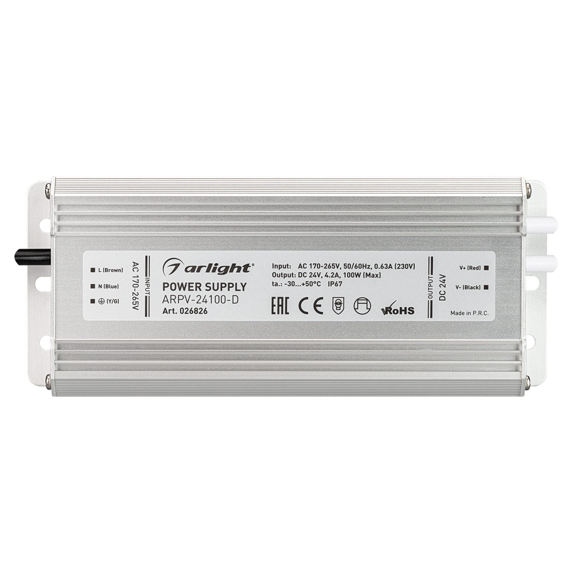 Блок питания с гальванической развязкой 24V, ток 4.2А, 100Вт. Герметичный (IP67), для светодиодных изделий. Алюминиевый корпус. Сертификат CE (EMC+LVD). Габариты 178x71x46 mm. Вход 170-265V AC, выход 24V DC +-0.5V. Гарантия 3 года. 026826