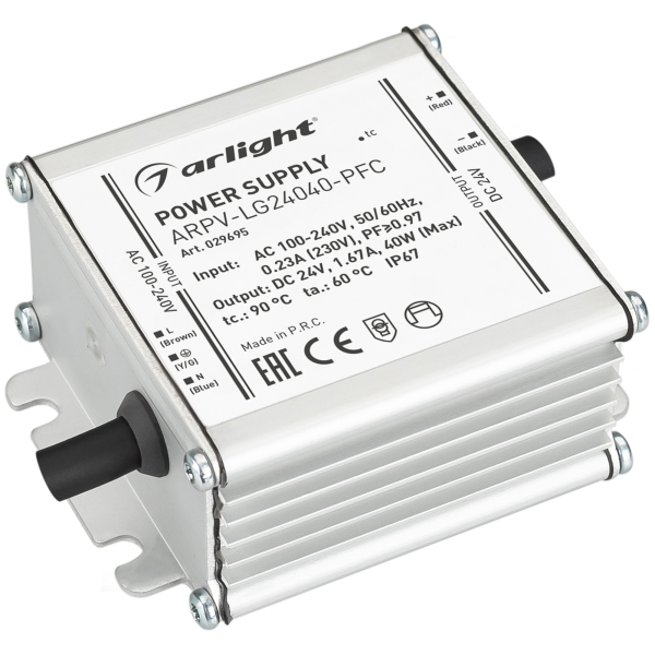 Блок питания для светодиодных лент с гальванической развязкой, корпус металл IP67, мощность 40 Вт; Входное напряжение 200-240V; Выход 24V 1,67A, PF>0,95; Размер 80x60x33,5 мм. Гарантия 5 лет. 029695