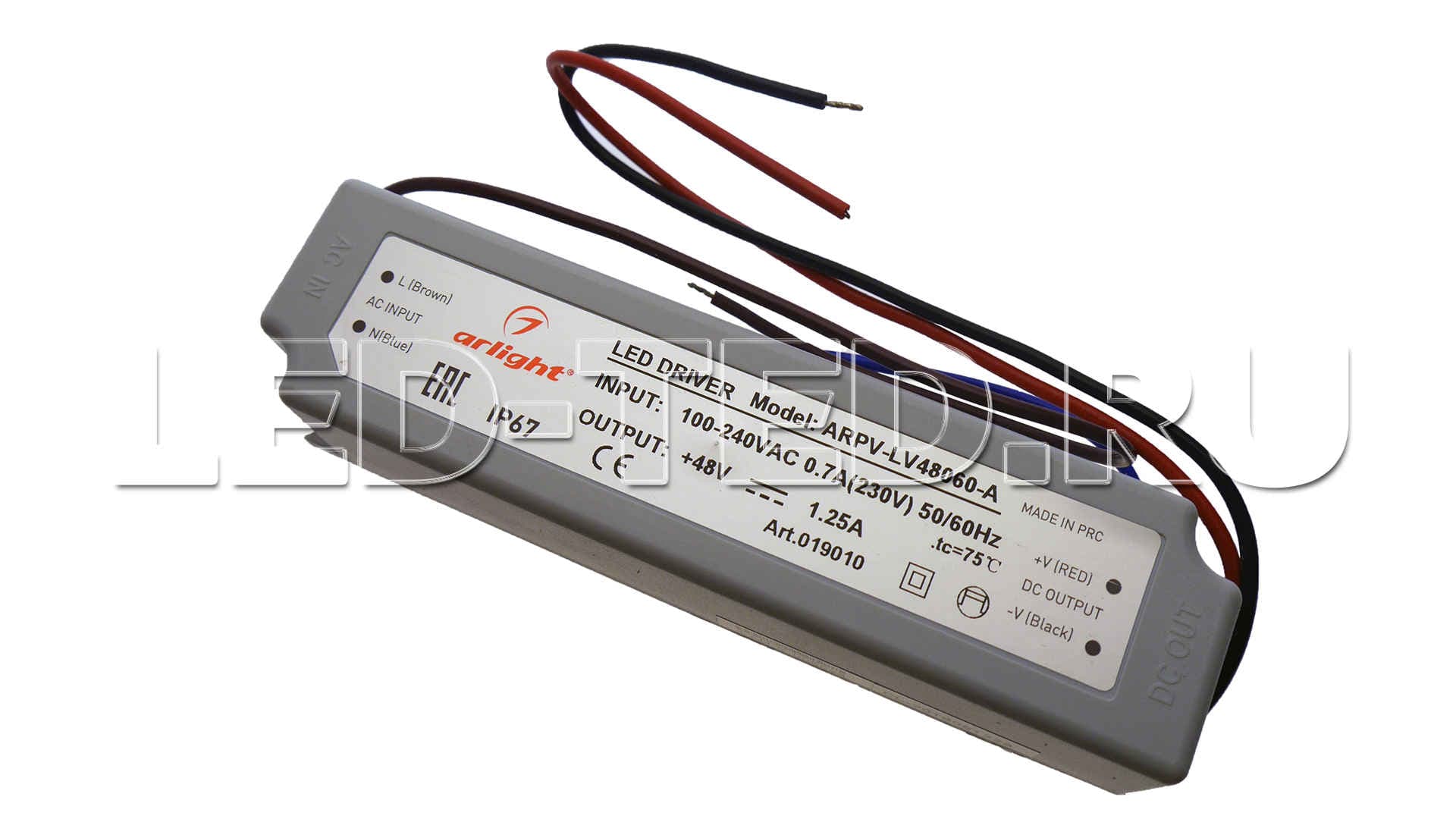 Блок питания 48V с гальванической развязкой, ток 1,25А, 60Вт. Герметичный пластиковый корпус IP67, для светодиодных изделий. Совместимость со стандартом EMC. Вход 100-240V AC, выход 48V DC +-5%. Размеры 162х42х34mm. Гарантия 3 года 019010