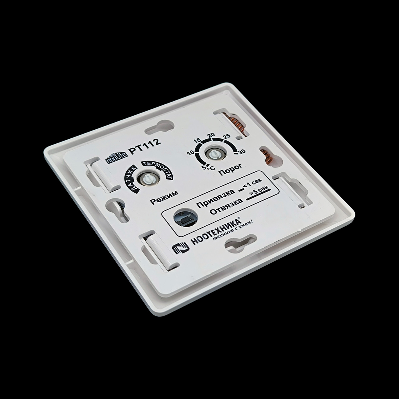 Датчик температуры PT112 предназначен для измерения температуры или использования в качестве термостата. Датчик не имеет собственных элементов индикации и взаимодействует с другими устройствами системы nooLite по радиоканалу. Для отображения измеренных значений температуры используется ethernet-шлюз PR1132. При использовании датчика в качестве термостата управление нагрузкой осуществляется через силовые блоки серии SL, SR (допускается применение и других серий силовых блоков, если они совместимы с выбранным типом нагрузки). Датчик в этом случае передает команды на включение/выключение силового блока. В режиме термостата датчик поддерживает установленную температуру. Включение силового блока с нагревателем происходит в том случае, если температура опустилась ниже установленного порога.