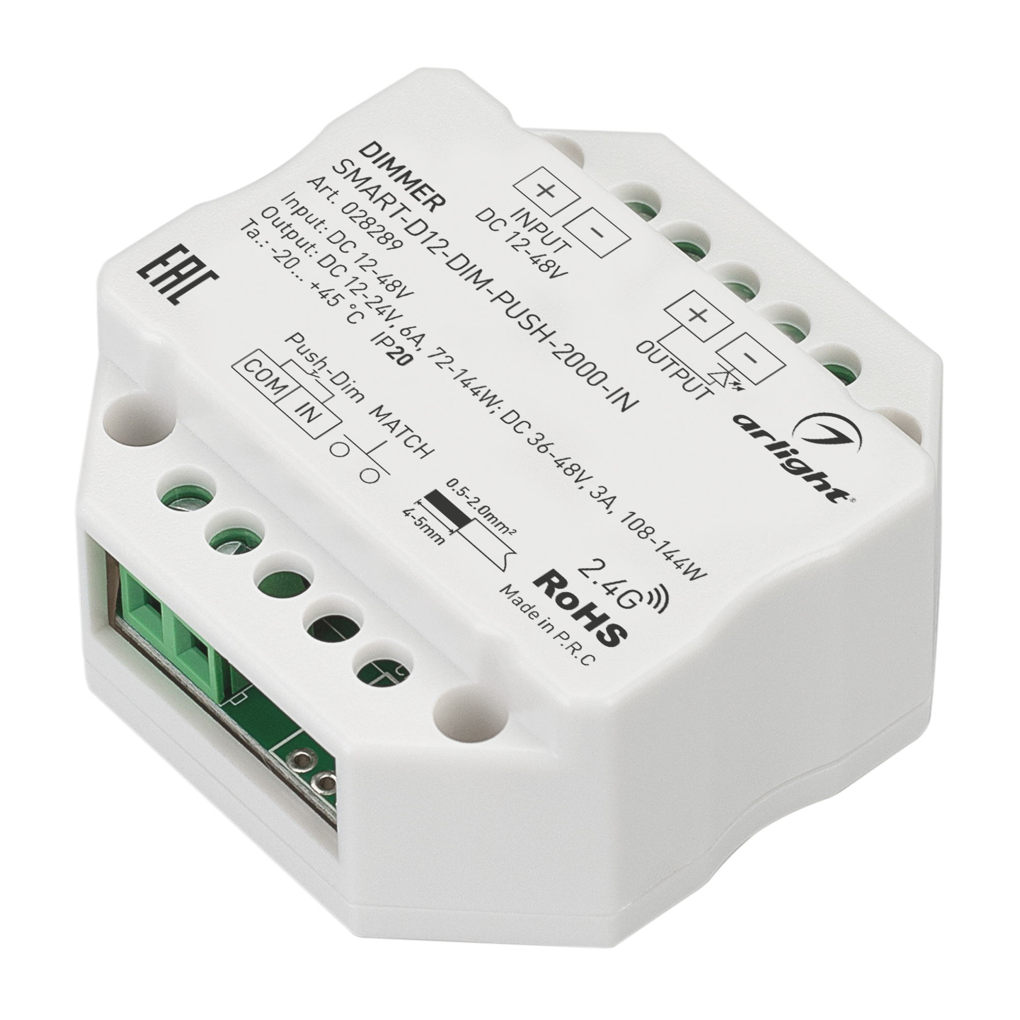 Диммер для монохромной светодиодной ленты (ШИМ) с функцией Push-Dim. Питание/рабочее напряжение 12-24VDC, максимальный ток 6A на канал при напряжении (DC12-24V) и 3А на канал при напряжении (DC36-48V), 1 канал. Максимальная мощность для 12-24V - 72-144W, для 36-48V - 108-144W. Винтовые клеммы, корпус - пластик. Габариты 52x52x26 мм, встраивается в стандартный подрозетник. Совместим с пультами и панелями SMART, поддерживающими диммирование по радиоканалу 2.4G. 028289 led-ted.ru
