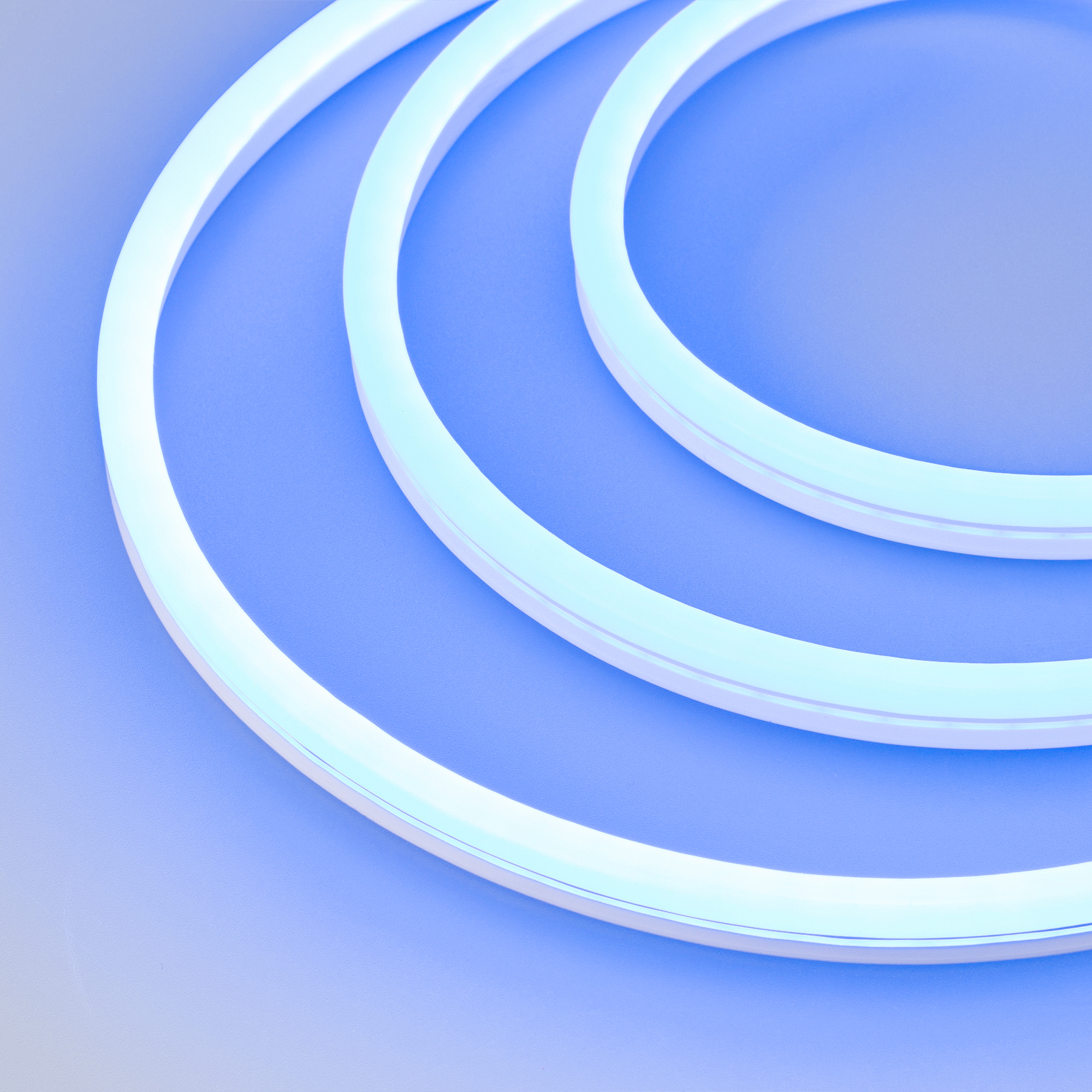 Гибкий неон GALAXY в силиконовой оболочке. Светодиоды SMD2835, 120 шт-м, цвет СИНИЙ. Сечение 16х8 мм, горизонтальный (боковой) изгиб, IP67, шаг резки 10 мм, мощность 12 Вт-м, напряжение питания DC 12V. Укомплектован заглушками и 30см проводом питания.