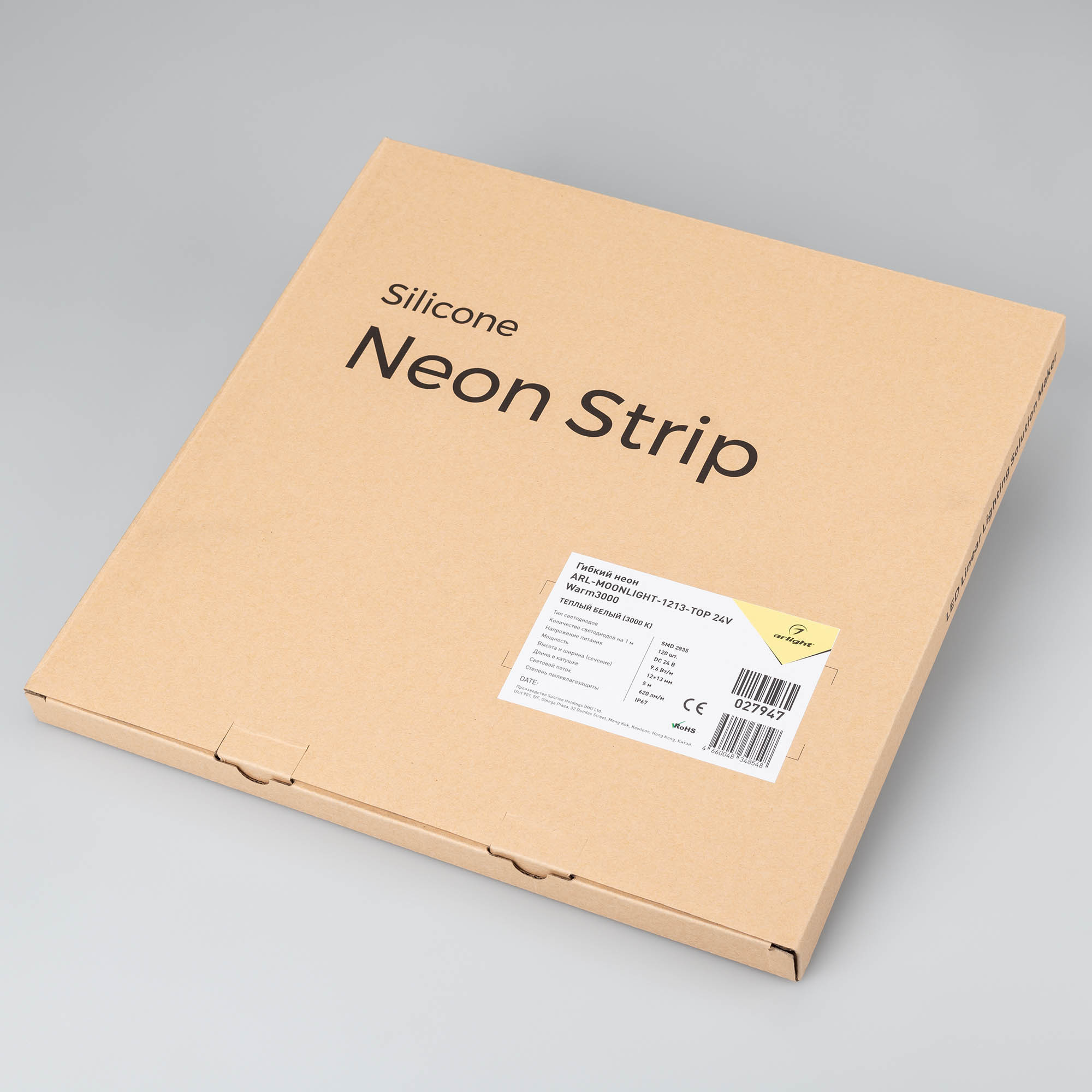 Гибкая герметичная лента (неон серии MOONLIGHT), сечение 13×12 мм. Светодиоды SMD 2835 120 шт/м. Цвет свечения ТЕПЛЫЙ БЕЛЫЙ (3000 К), индекс цветопередачи CRI>80, световой поток 620 лм/м, угол излучения 115°. Мощность 9.6 Вт/м, питание 24 В. Класс пылевлагозащиты IP67. Размеры 5000×13×12 мм. Мин. отрезок 50 мм. Вертикальный изгиб TOP, минимальный радиус изгиба 60 мм. Катушка 5 м. Цена за 1 м. Гарантия 3 года.