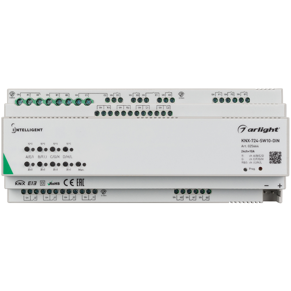 Релейный модуль 24-ти канальный для KNX систем. Установка на DIN рейку. Возможно использование как простого релейного модуля, так и в качестве контроллера штор/жалюзи. Возможность ручного управления. Напряжение питания DC 21-30V от шины данных. Максимальный коммутируемый ток - 10А/канал.