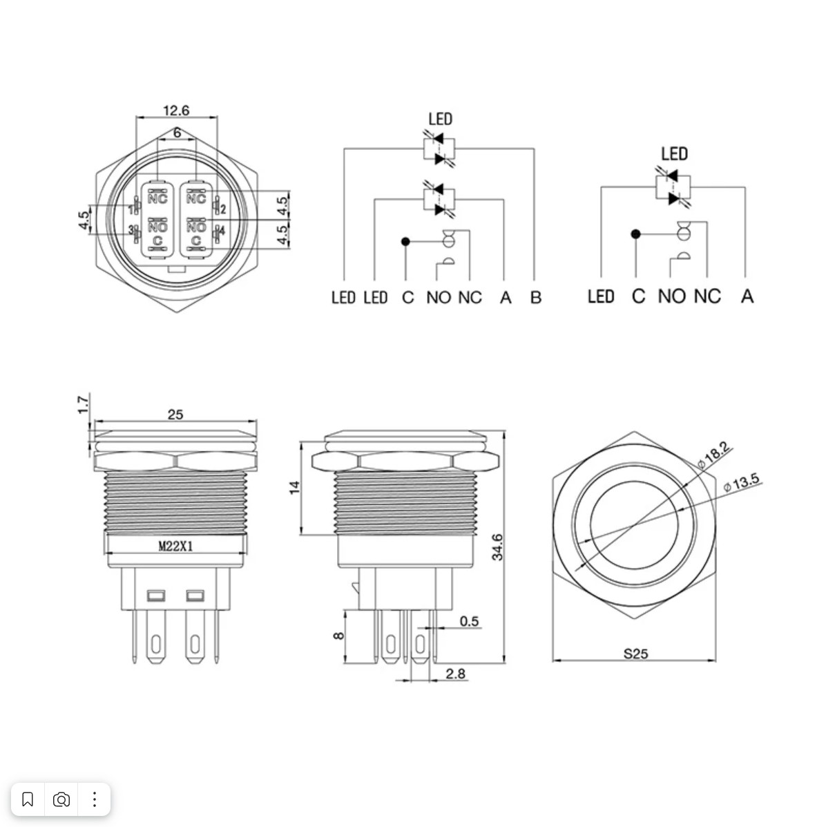 Напряжение: 250В / Ток: 5A / Тип переключения: (ON)-OFF/(OFF)-ON  / Кол-во контактных групп: 2 / Кол-во контактов в контактной группе: 2 / Фиксация положений: нет / Индикатор коммутационных положений: красный / Установочный диаметр: 22мм / Раб. темп.: от -25℃ до +85℃ / Степень защиты: IP67 / Ресурс: 10 000 циклов.