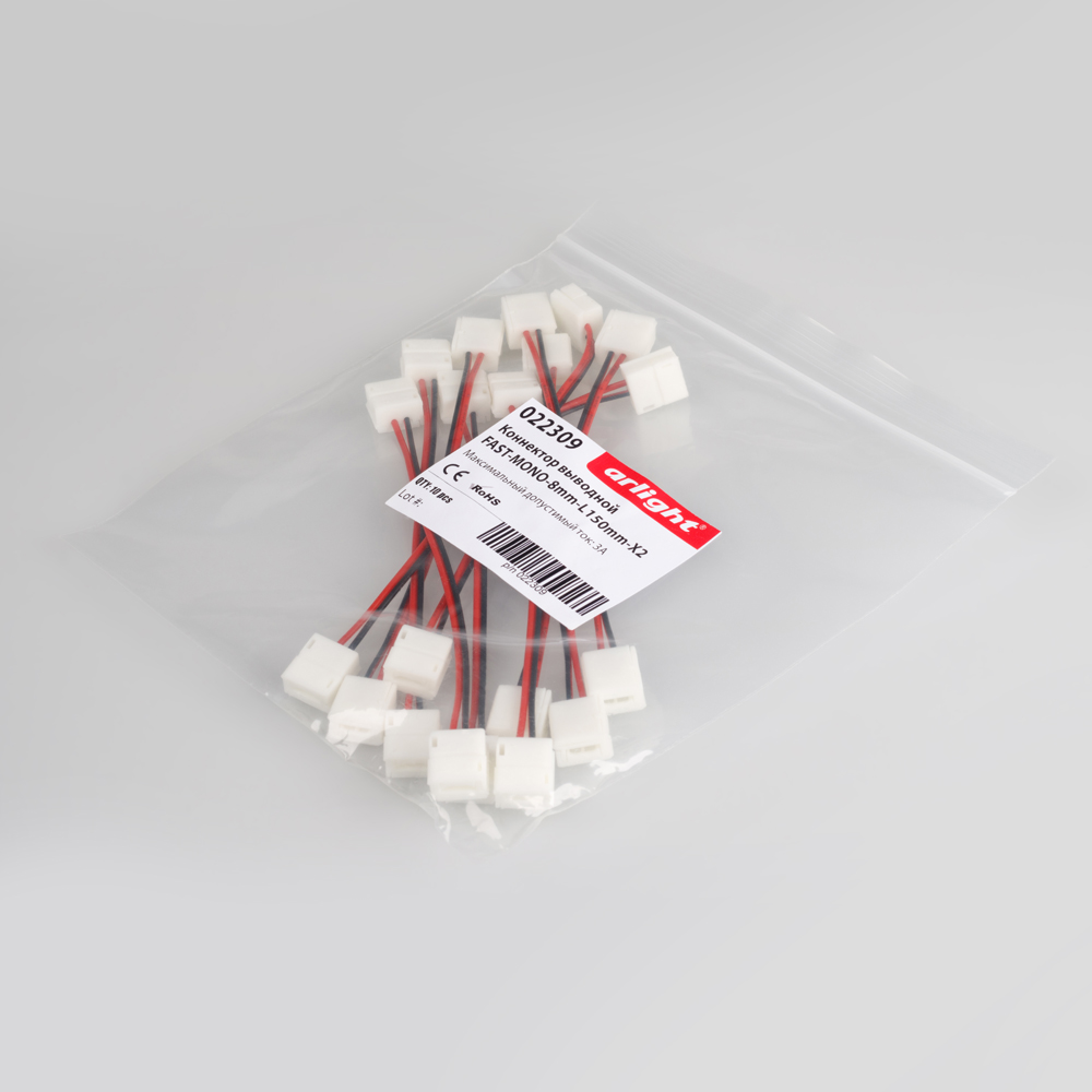 Двойной коннектор с проводом 15см для соединения 2-х отрезков ГЕРМЕТИЧНЫХ светодиодных одноцветных лент шириной 8мм. Материал - пластик. Максимальный допустимый ток 3А, напряжение до 50 В. Цена за 1шт.