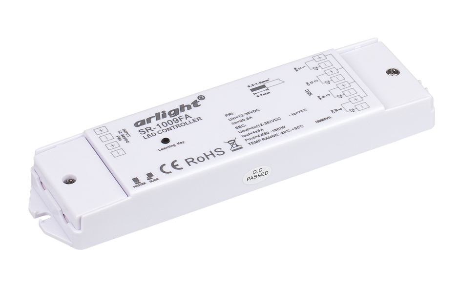 Контроллер для светодиодной RGBW ленты (ШИМ). Питание/рабочее напряжение 12-36VDC, максимальный ток 5A на канал, 4 канала, максимальная мощность 240-480W. Винтовые клеммы. Корпус - PVC. Габариты 178х46х18 мм. Управляется пультами и панелями серии SR-1009x (поставляются отдельно). Список совместимых пультов и панелей смотрите в сопутствующих товарах и в инструкции. Полностью заменяется на 018268.