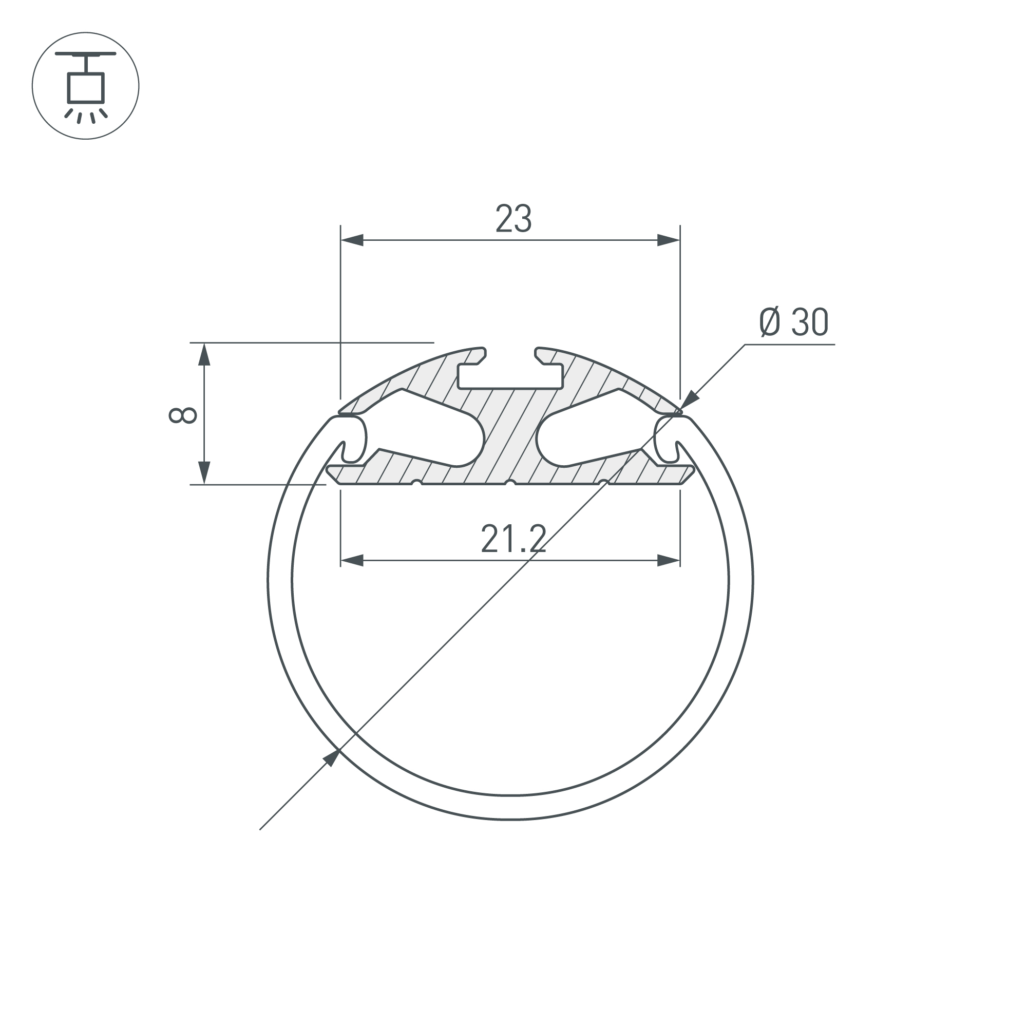 Профиль для круглых подвесных светильников, угол освещения до 180°. Площадка для лент 20мм (для 2-х лент шириной 10 мм.) Размер 2000х23х8мм. 023860 Рассеиваемая тепловая мощность на 1м, PD    max: 16 W