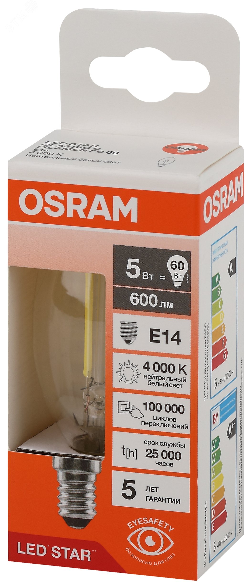 Наименование в прайсе производителя Лампа светодиодная филаментная OSRAM LED Star, 600лм, 5Вт (замена 60Вт), 4000К (нейтральный белый свет). Цоколь E14, колба B, угол пучка 300°. Исполнение колбы прозрачное, стекло. Напряжение питания 220-240В. Особенности: гарантия 5 лет. Товар сертифицирован.