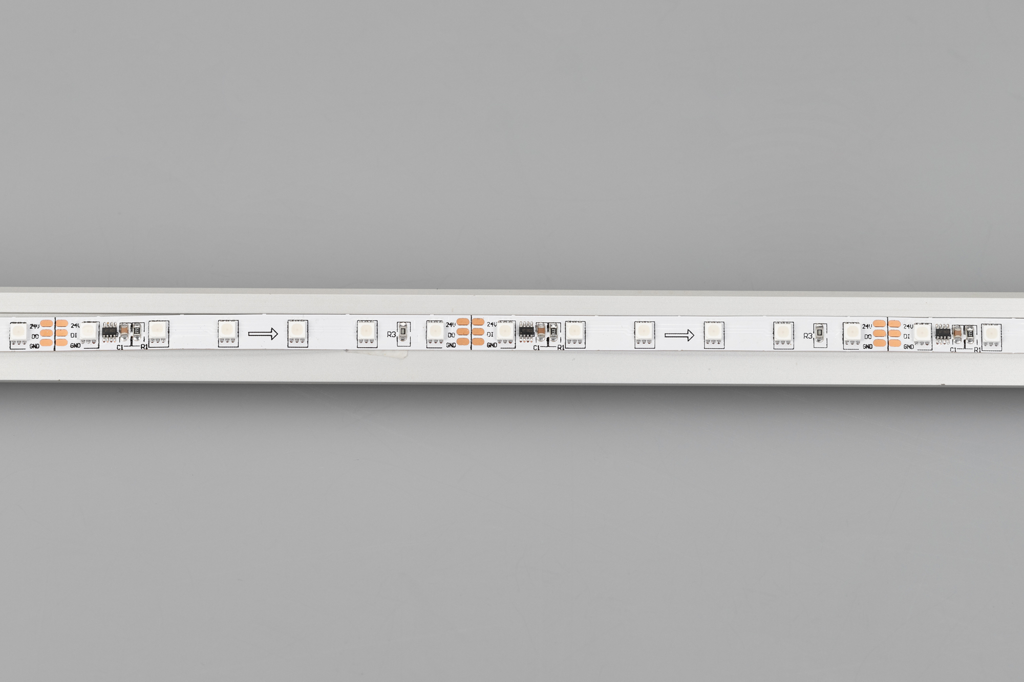 Открытая лента «Бегущие огни» с драйвером 1903MT1803. Длина 5м, 360шт LED RGB 3535, 12 pixel/m 1 pixel = 6 LED. Управление от внешнего контроллера SPI. Питание 24V, макс. мощн-ть 14.4 Вт/м статический белый цвет. Ширина 7 мм. Негерметичные прямоугольные коннекторы 3 PIN