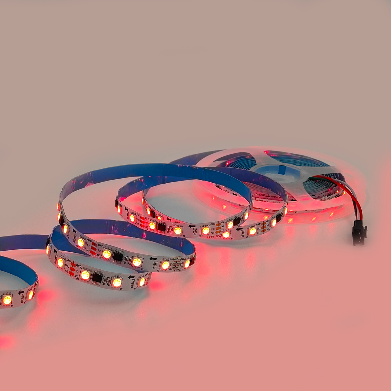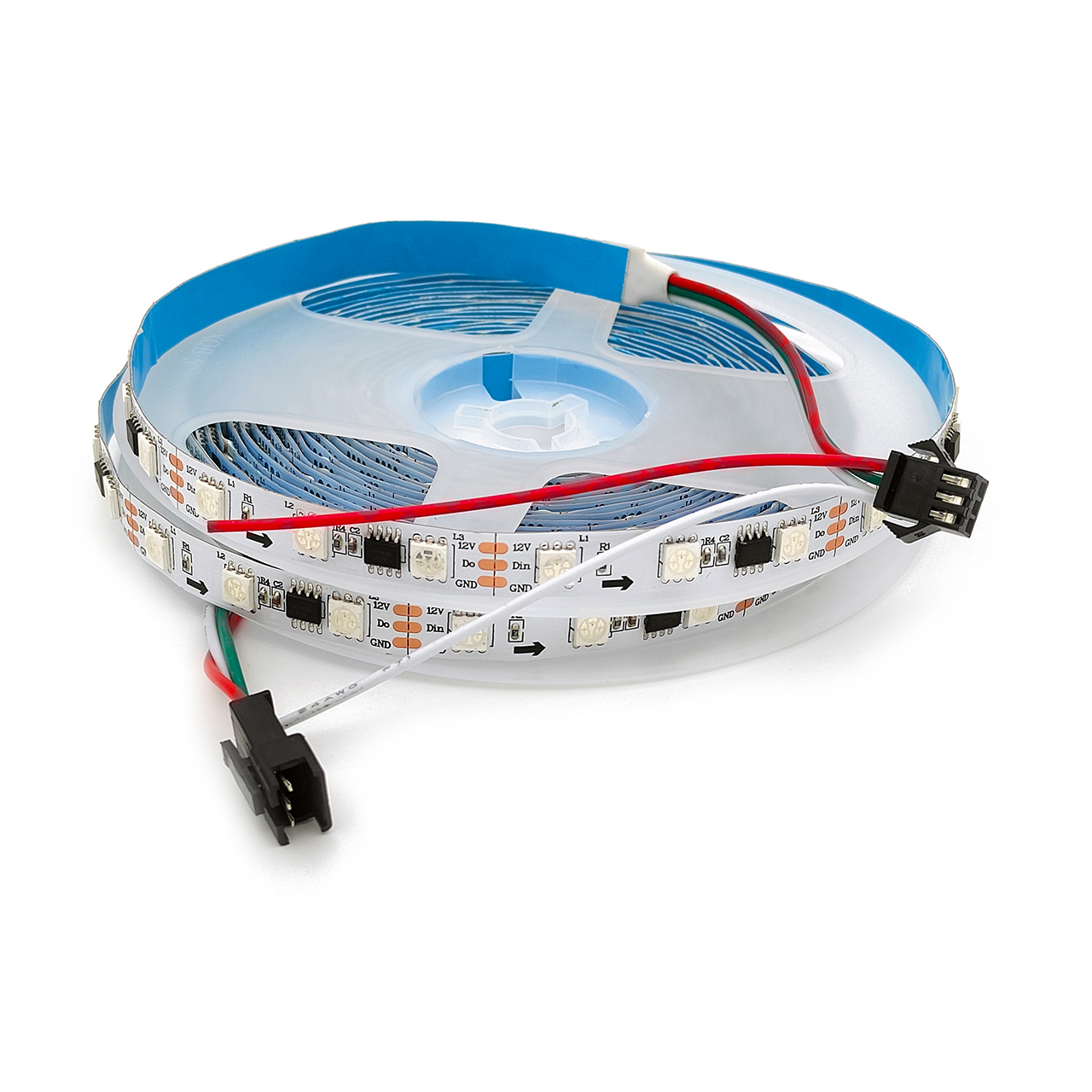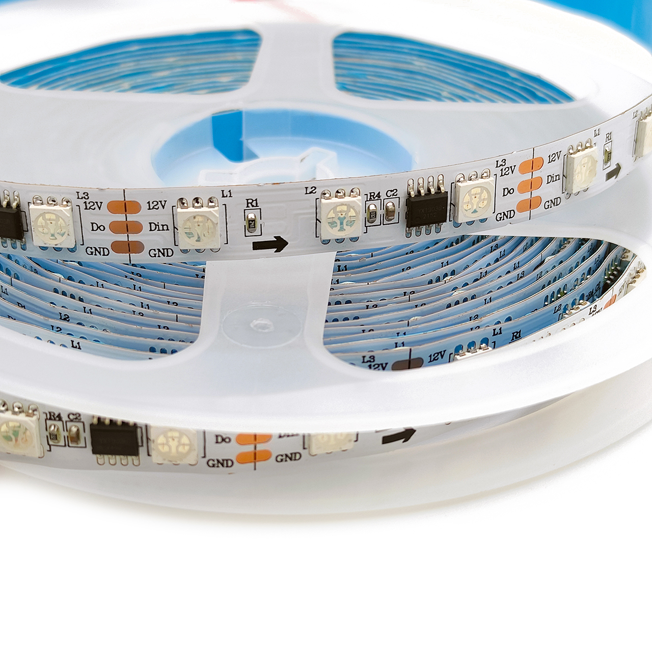 Светодиодная лента многоцветная RGB SPI "Бегущий огонь". Светодиоды SMD 5050 60 шт/м. Напряжение питания 12В, мощность 14.4 Вт/м. 1 пиксель - 3 светодиода. Простое подключение к контроллеру RG-KQ-06 SP611E.