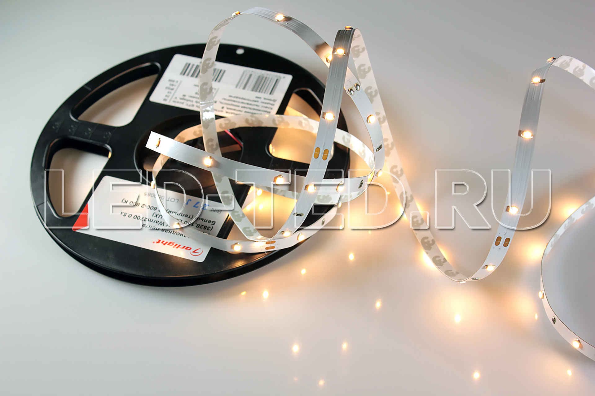 Гибкая лента LUX, светодиоды smd 3528, 30шт/м (150шт на 5м), белая плата 8мм, скотч 3М. Цвет ТЁПЛЫЙ 2600-2800K. Питание 24V, мощность 2.9 Вт/м (14.5 Вт на 5м), угол 120°, цветопередача CRI>85. Размеры 5000х8x2мм. Мин.отрезок 166.66мм, 5шт светодиодов. Пакет 5м. Цена за 1м.