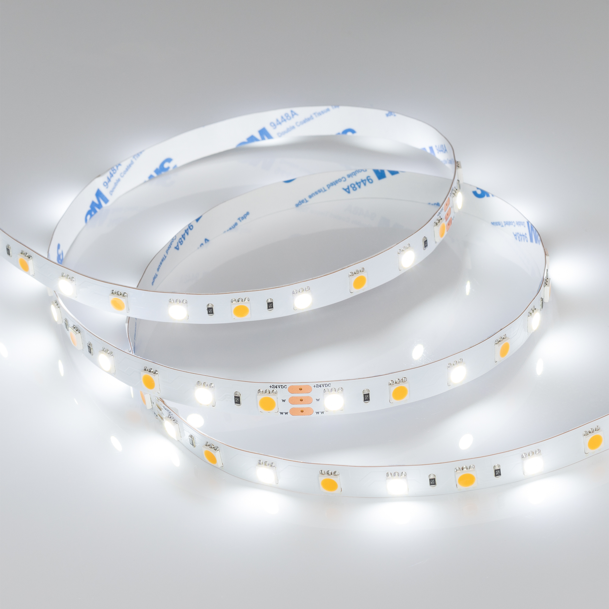 2-х канальная лента LUX с изменяемой цв.температурой, светодиоды smd 5060, 60шт/м (300шт на 5м), белая плата 10мм, скотч 3М. Два цвета БЕЛЫЙ 6500K + ТЁПЛЫЙ 2700K. Угол 120°, цветопередача CRI>90. Питание 24V, мощность 14,4 Вт/м (72 Вт на 5м). Размеры 5000х10х2,2мм. Мин.отрезок 166мм, 10 светодиодов. Цена за 1м.