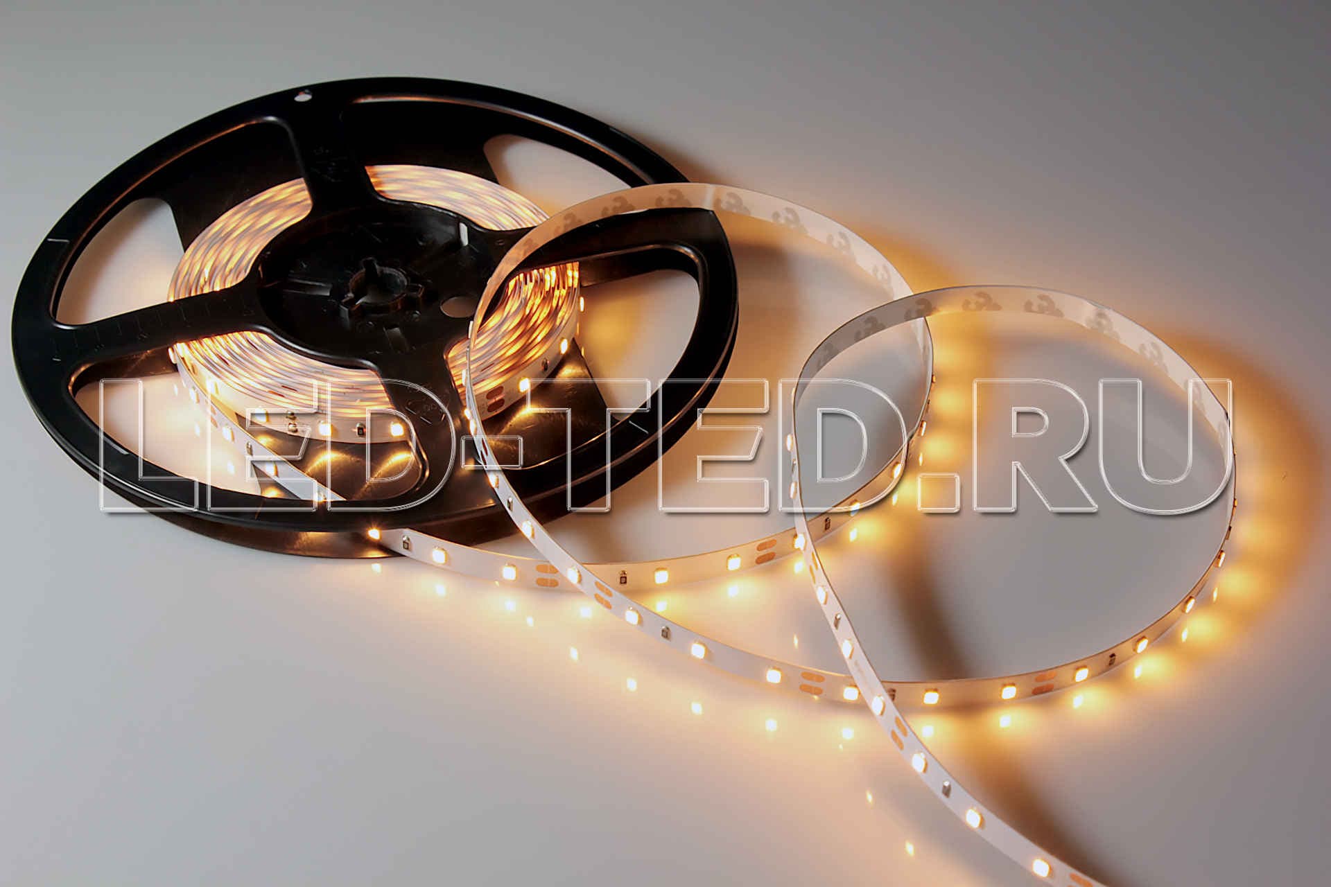 Гибкая лента PRO, светодиоды smd 2835, 60шт/м 300шт на 5м, белая плата 8мм, скотч 3М. Цвет ТЁПЛЫЙ как свеча 2200-2400K. Питание 12V, мощность 7.2 Вт/м 36 Вт на 5м, угол 120°, цветопередача CRI>85. Размеры 5000х8x1.5мм. Мин.отрезок 50мм, 3 шт светодиода. Пакет 5м. Цена за 1м. 018108