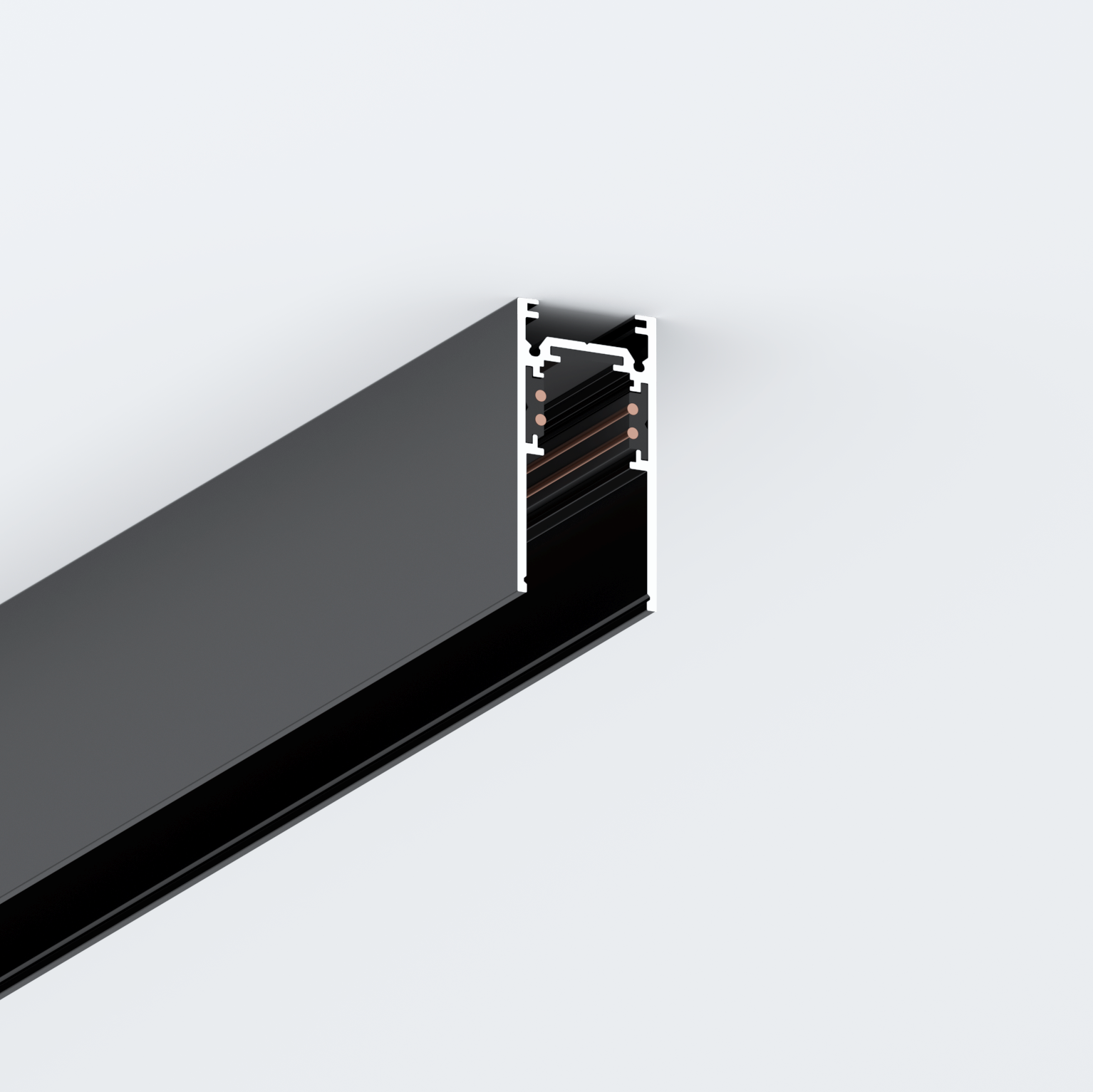 Накладной магнитный шинопровод, длина 3 метра. Монтируется к потолку из бетона, дерева, ГКЛ на саморезы. Возможен вариант монтажа на подвесах. 2 варианта подключения: к внешнему блоку питания —48В с помощью коннектора питания и к блоку питания —48В, устанавливаемого внутрь шинопровода.