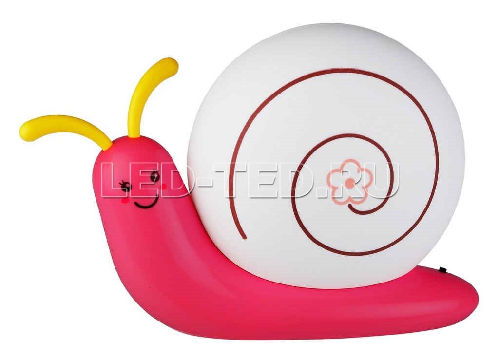 Настольный светильник со светодиодами (LED), 0,5W  + 5..+40°C Светильник-ночник со светодиодами (LED) в качестве источников света. Встроенный аккумулятор для автономной работы. Сетевой адаптер в комплекте. Светильник работает во время зарядки от сети. Детский дизайн в виде улитки с поворачивающимися "рожками". 9,5 х 22 х 15 см