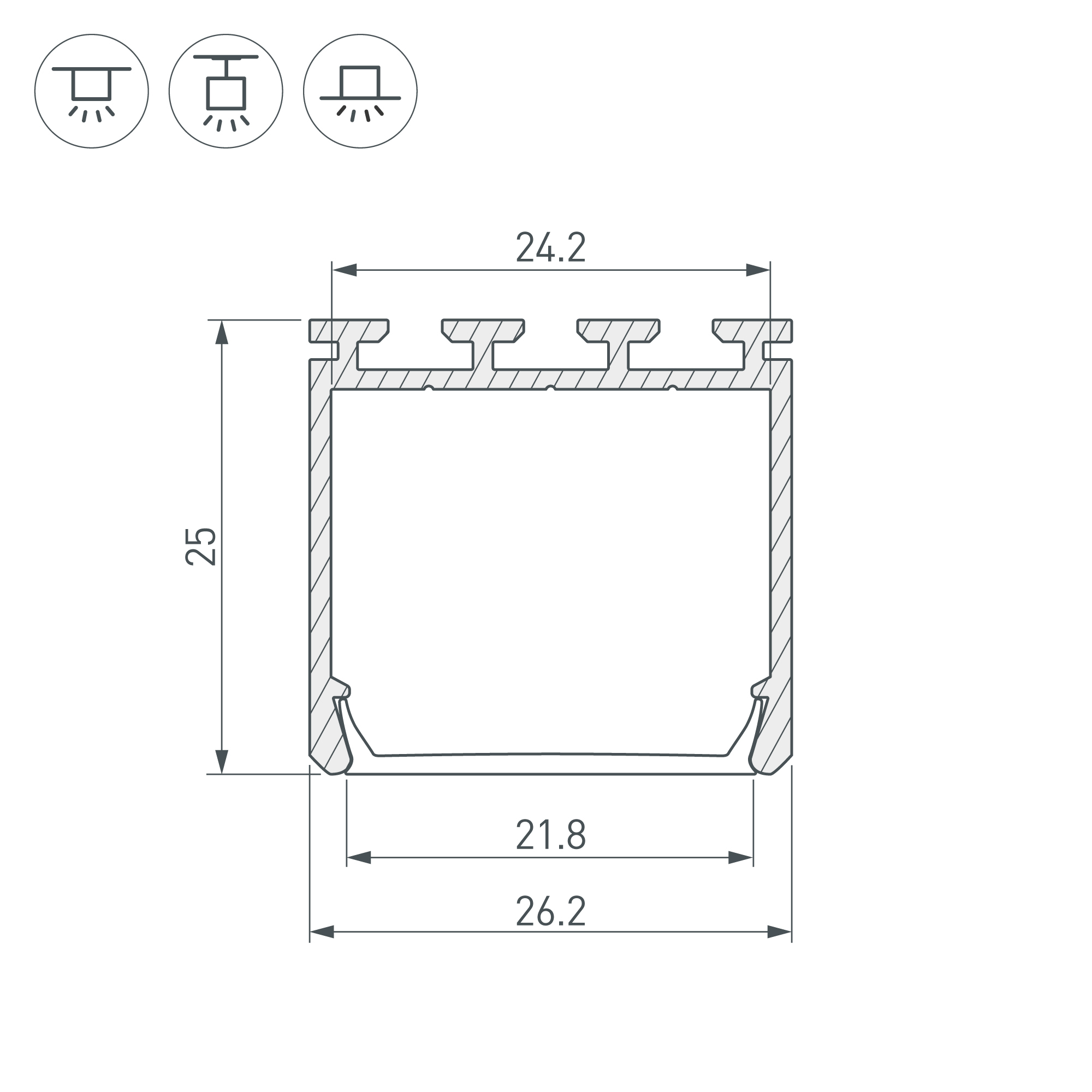 Алюминиевый анодированный профиль для светодиодных лент и линеек. Габаритные размеры (L×W×H): 2000x26,2x25 мм. Ширина площадки для ленты 24,2 мм. Экраны, заглушки и другие аксессуары приобретаются отдельно. Цена за 1 метр.