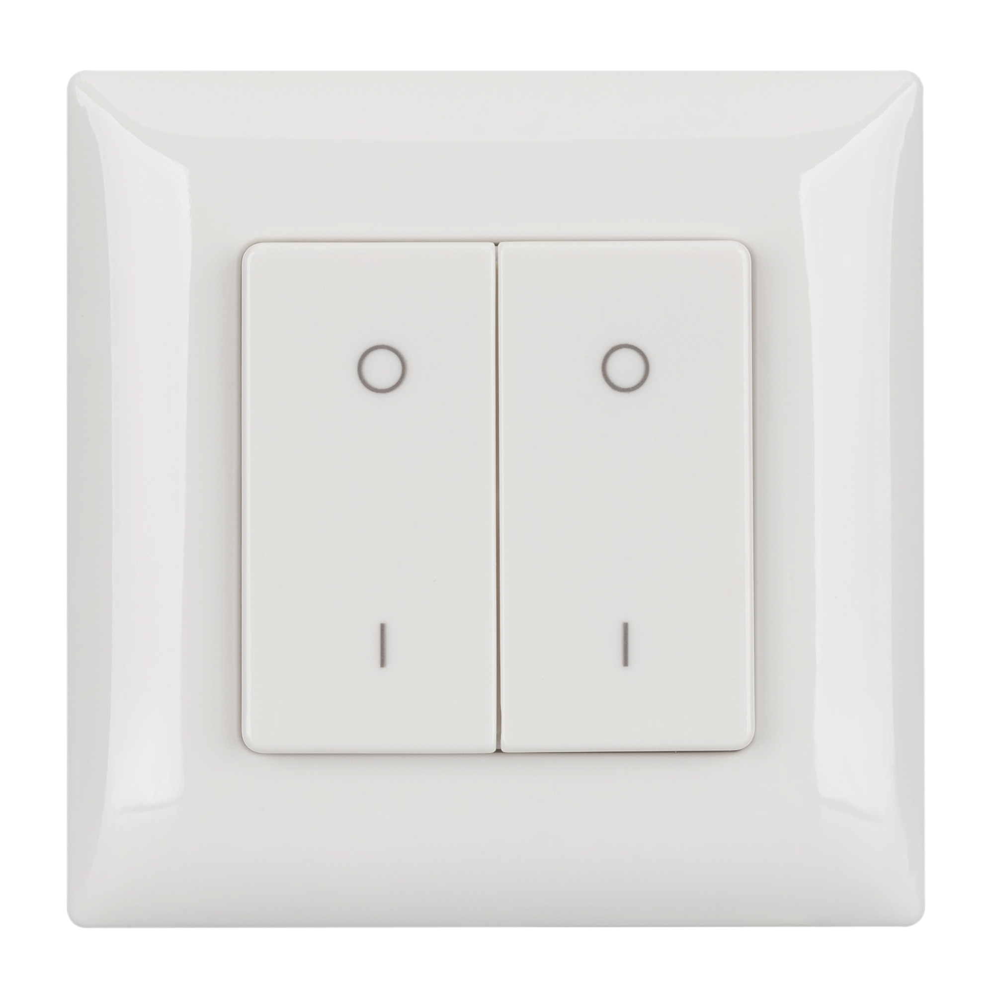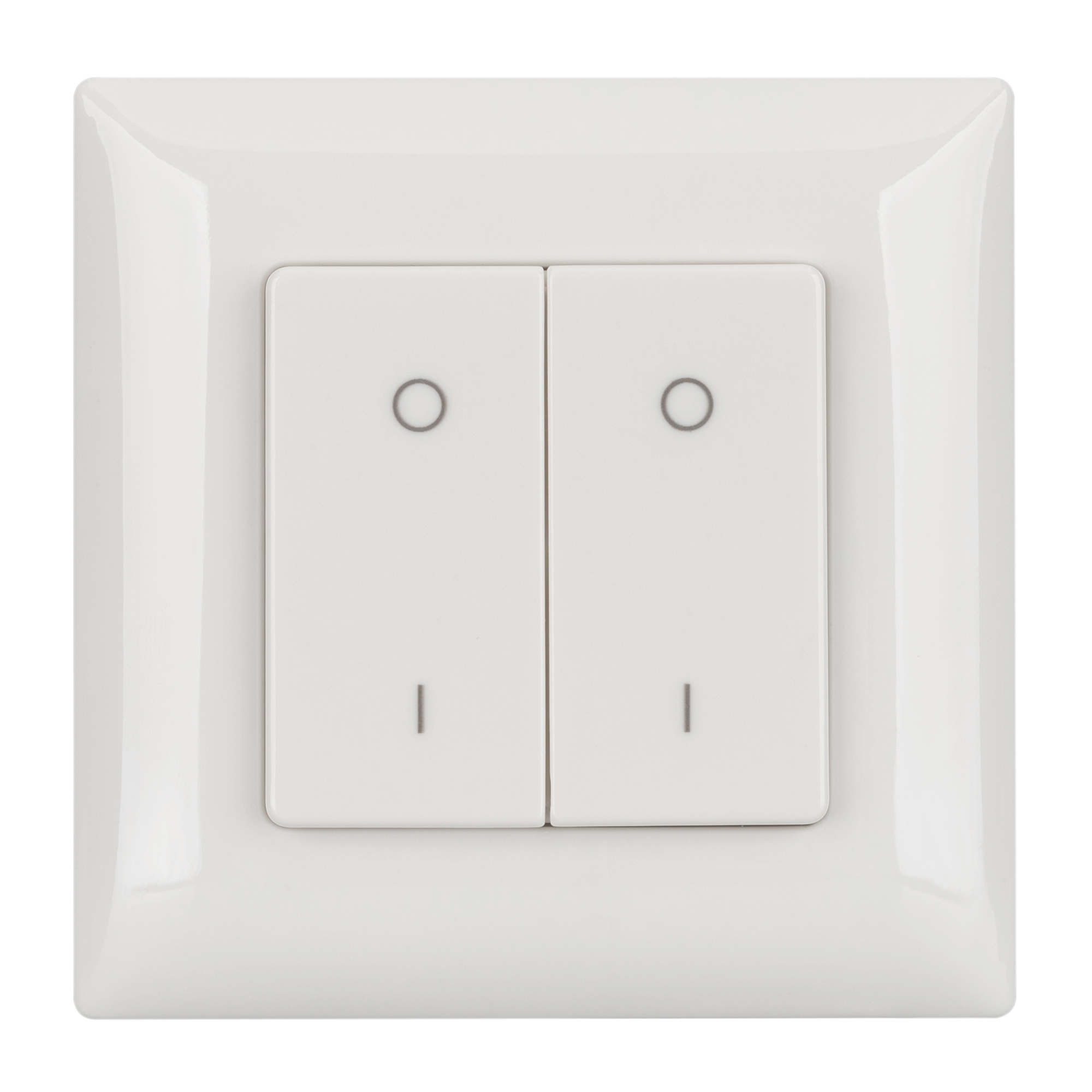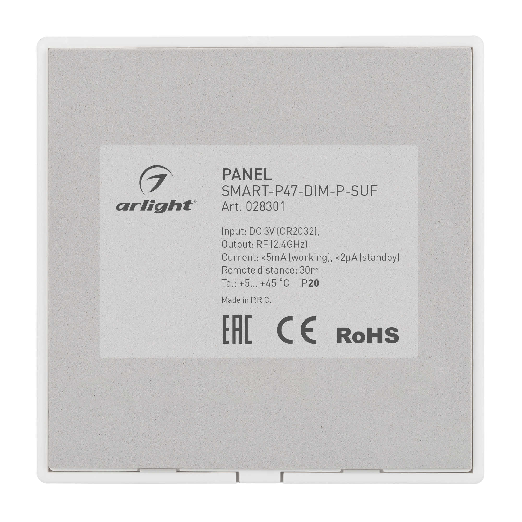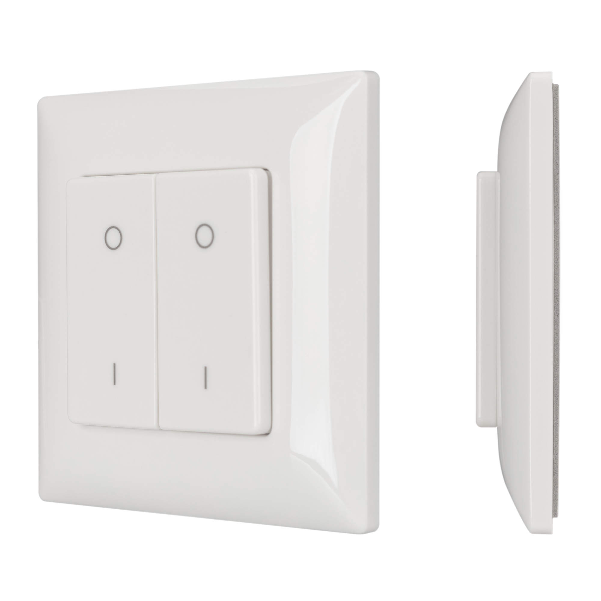 Накладная кнопочная панель 2.4 ГГц, цвет белый. Материал - пластик. Для управления одноцветными источниками света (ШИМ), 2 зоны управления. Питание/рабочее напряжение 3VDC от батарейки CR2032. Габариты 86х86х14 мм. Панель совместима с диммерами серии SMART.