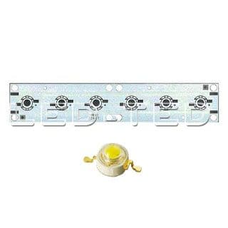 Алюминиевая плата. Размеры 160x30 мм. Цвет белый. Для 6-ти одноцветных светодиодов типа Emitter. Под блочную линзу 3LBxx.