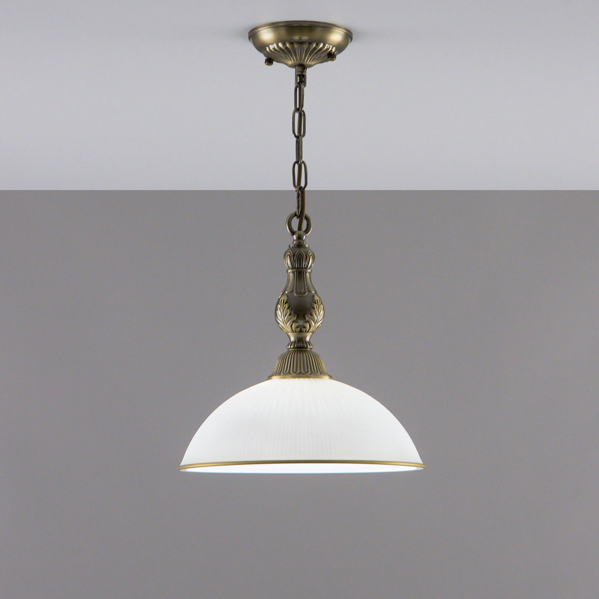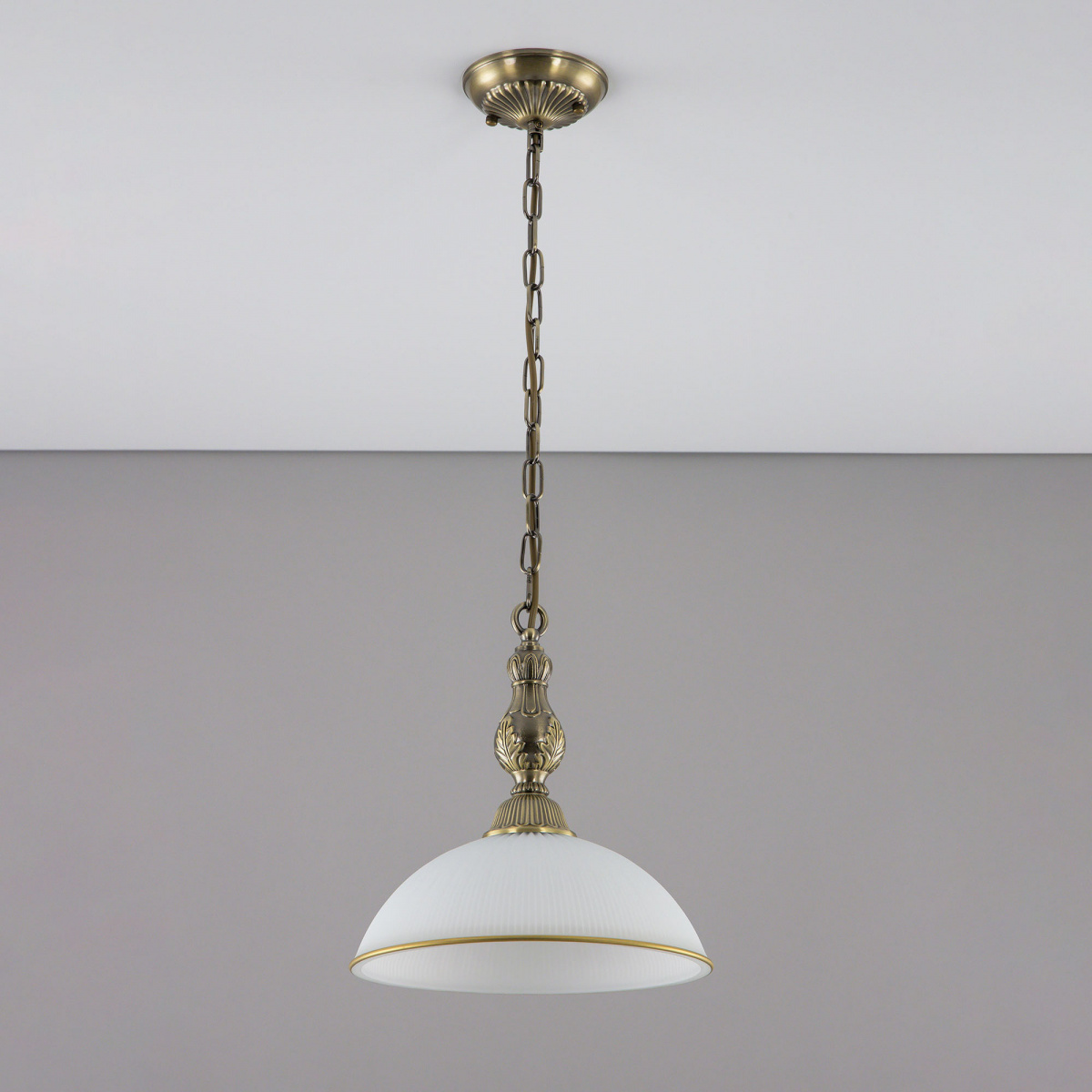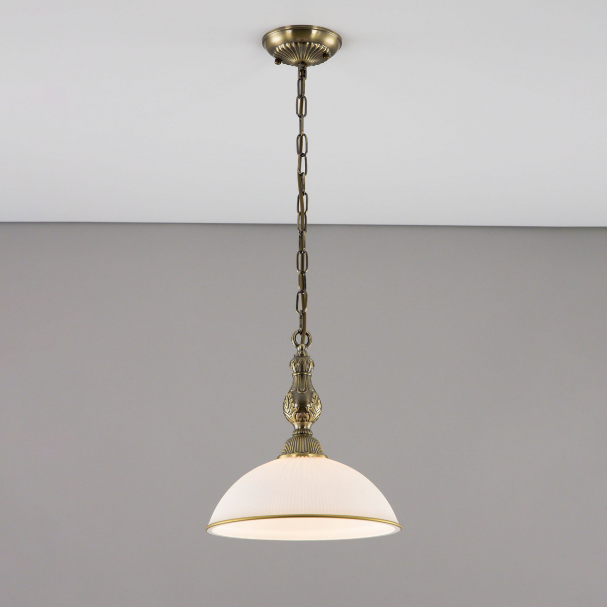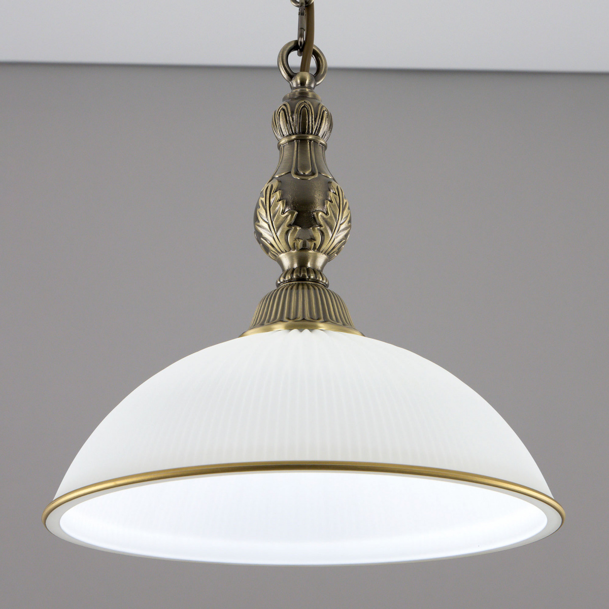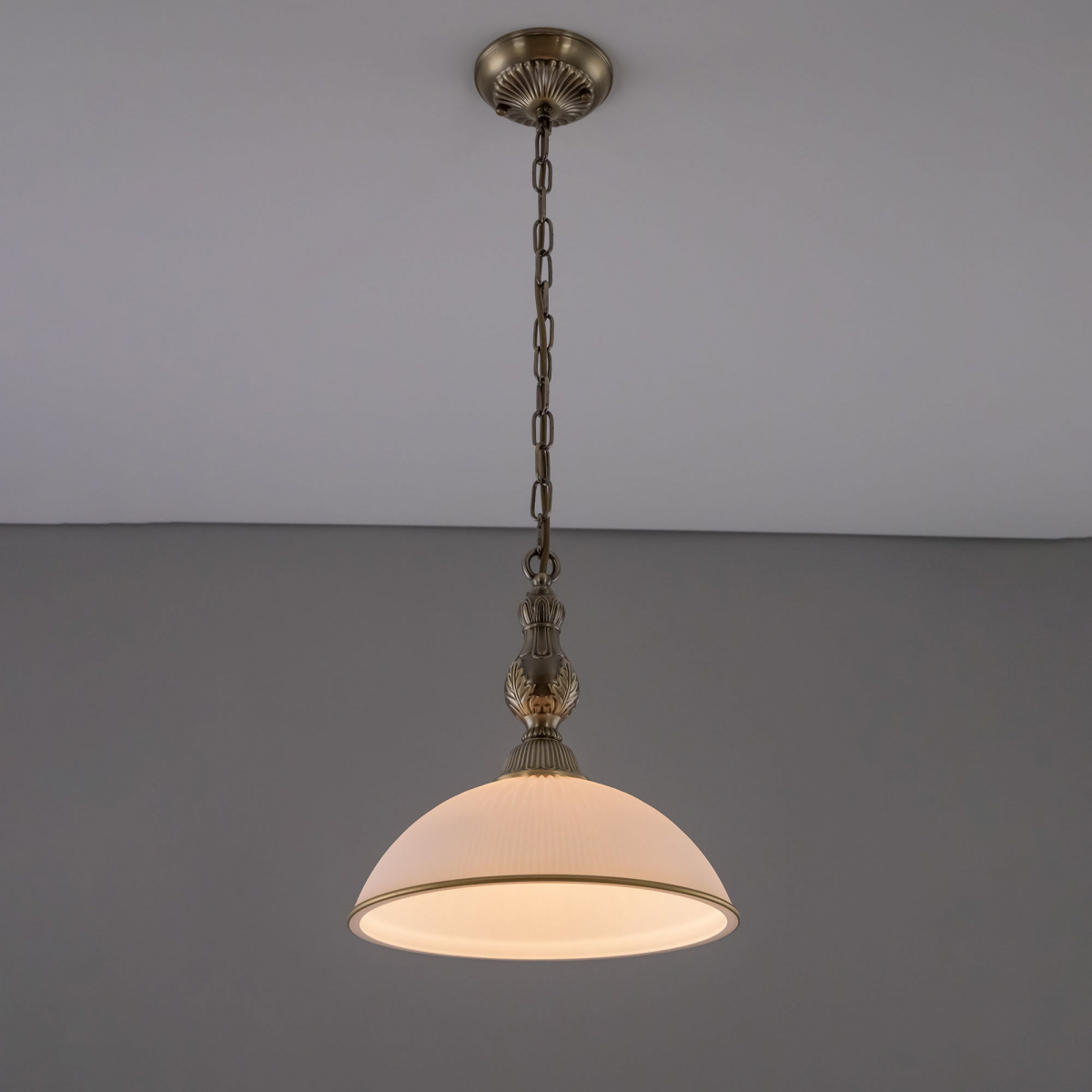 Светильник Citilux Адриана CL405213 в классическом стиле. Основание металлическое, цвет бронза. Плафон стеклянный, матовый, рифленый с благородной золотистой окантовкой. Высота подвеса легко регулируется при установке в диапазоне от 33см до 1м. Более того, изделие можно использовать как потолочную модель, вообще без элементов цепи. В светильнике 1 лампа с цоколем Е27 максимальной мощностью для ламп накаливания 75Вт. Светодиодные лампы можно устанавливать более яркие. Площадь освещения около 4,5м². Тип крепления к потолку-планка.