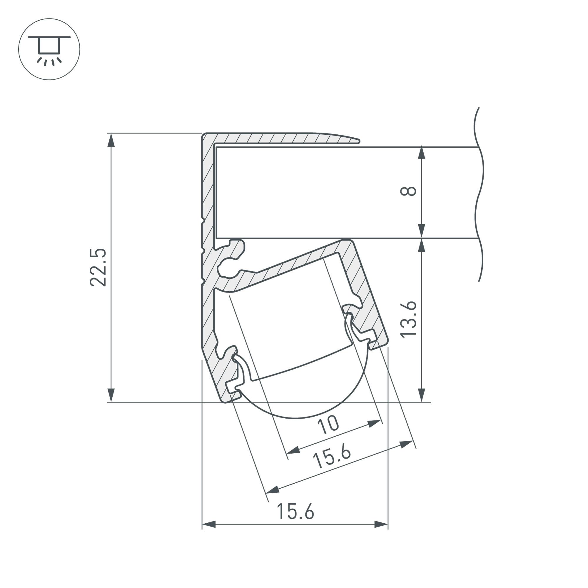 Накладной алюминиевый профиль для стекла 8мм. Подходят светодиодные ленты шириной до 10мм. Серебристый, анодированный. Размер 2000х22,5х15,6 мм. Отдельно поставляются экраны P15C/W/F, K13C/W, экран-линза K13L, заглушки. 021827